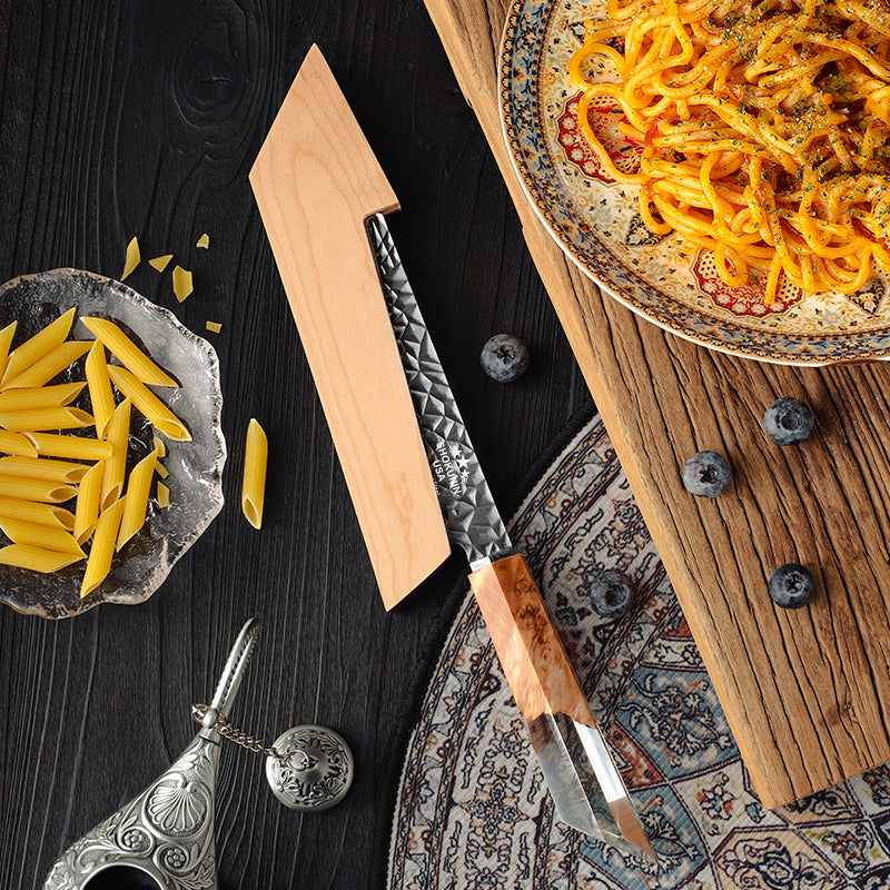 The blade is carefully made by combining VG10 and 15n20 steel through layering, welding, and hammering. This process gives each blade its own unique design, like a fingerprint. Each knife is a one-of-a-kind work of art.