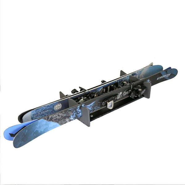 The TRAPSKI LowPro 2 S rack in Charcoal, holds 2 pairs of skis & poles inside a Cargo Box.