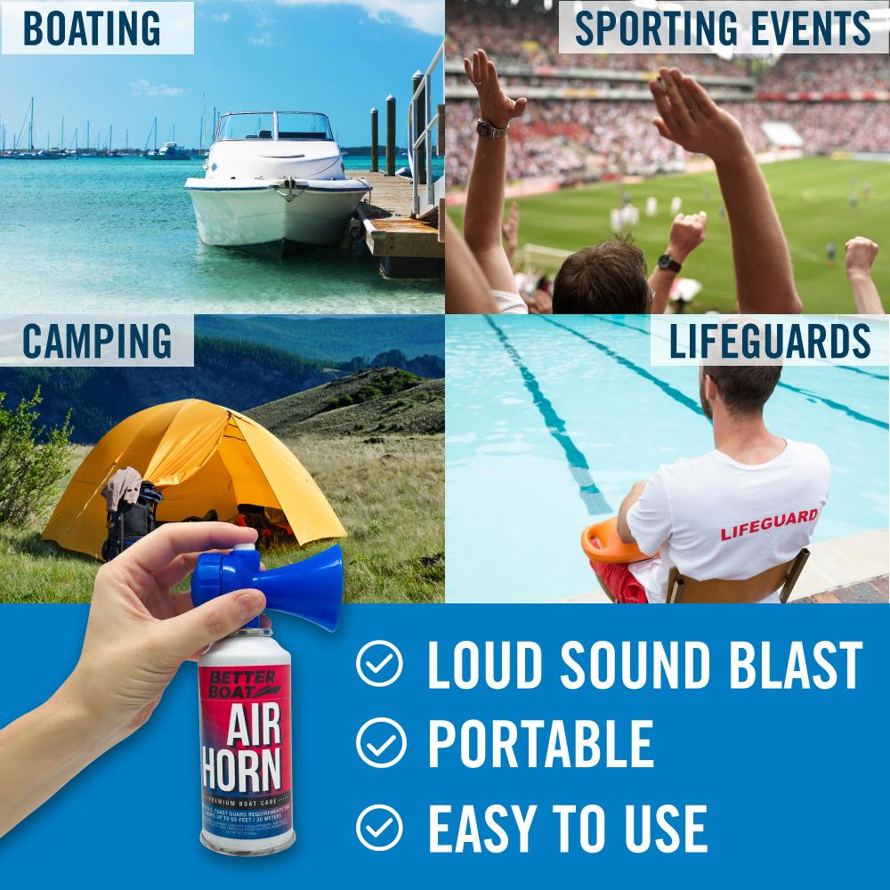 Don't let the small size fool you! Better Boat's compressed Air Horn for sale emits a loud, powerful sound blast heard from 1/2 mile away. Meets the U.S. Coast Guard requirements for boats up to 65 feet. Keep it on board in case of emergency. This personal air horn is small enough to be easily stowed on a jet-ski, kayak, or canoe. It also works great for runners, camping and sporting events! Try it risk-free for 30 days - love it or get your money back!