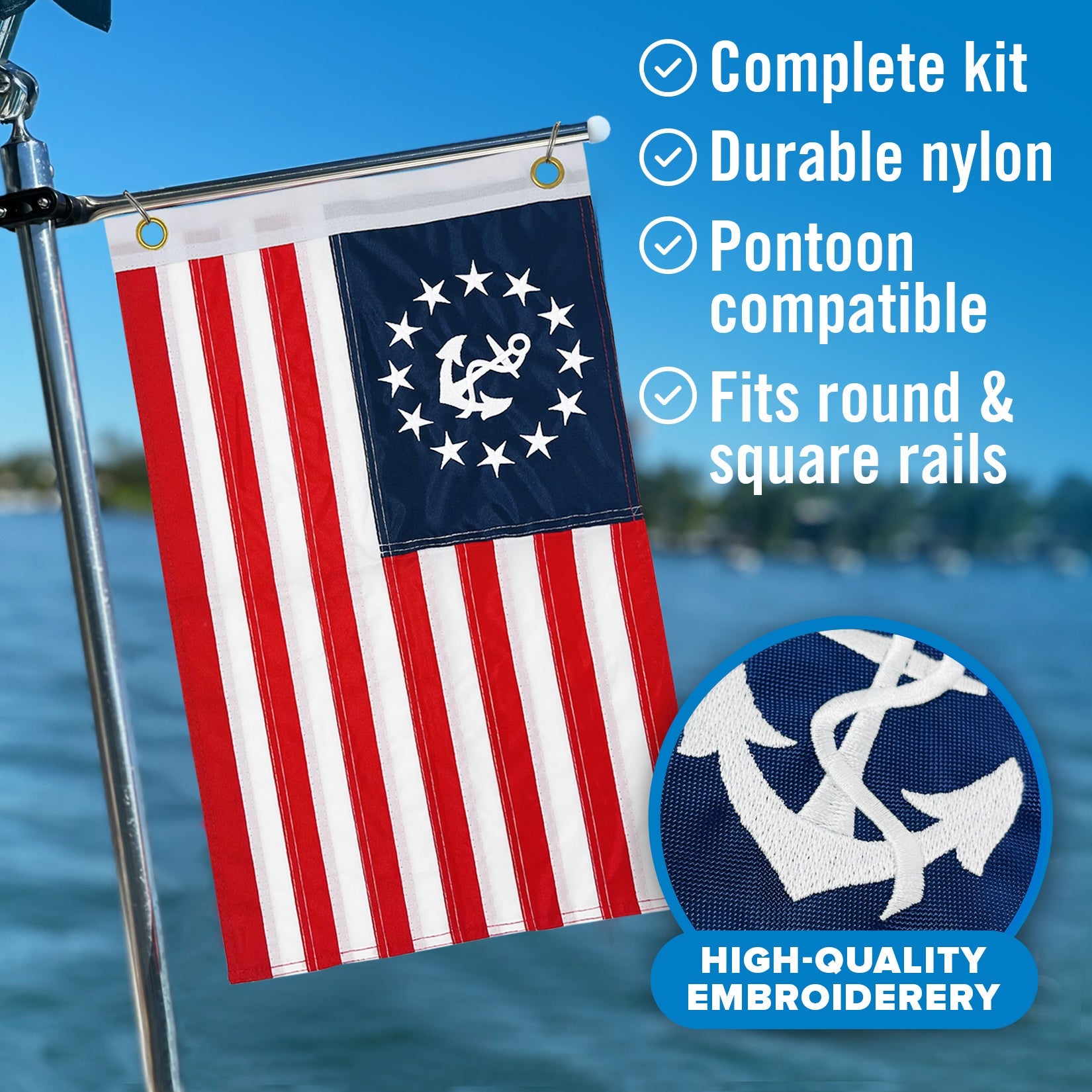 - Complete Set: Our boat flag kit comes with an US Yacht Ensign Flag with pole for boat rails or as a boat dock flag. New Design to fit square pontoon 1.5" rails or round railing complete with pole & screws. The perfect in pontoon boat accessories.