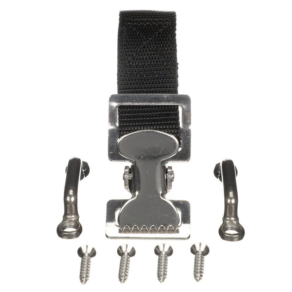 This Attwood Fuel Tank Strap Set contains everything needed to secure a 3-6-gallon fuel tank in place. This kit includes a 48-inch-long, 1-inch-wide white nylon web strap with a zinc-plated carbon steel snap and quick-release buckle. There are also 2 metal footman securing loops and the screws needed to install them. The strap can be run through the footman openings and then tightened and buckled to hold the tank in place.