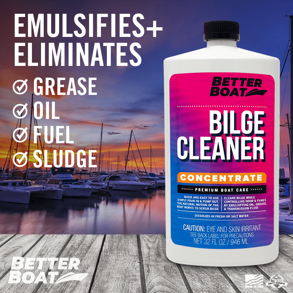 Our Better Boat marine bilge cleaner concentrate emulsifies oil, fuel and grease with bilge water allowing it to be pumped out. No scrubbing required! Simply pour in and the motion of the boat does the work. It loosens built-up grime from the bilge surface and hard to reach places. Eliminates bilge odor and is a great value - a little goes a long way. Try this bilge degreaser risk-free for 30 days, love it or get your money back!