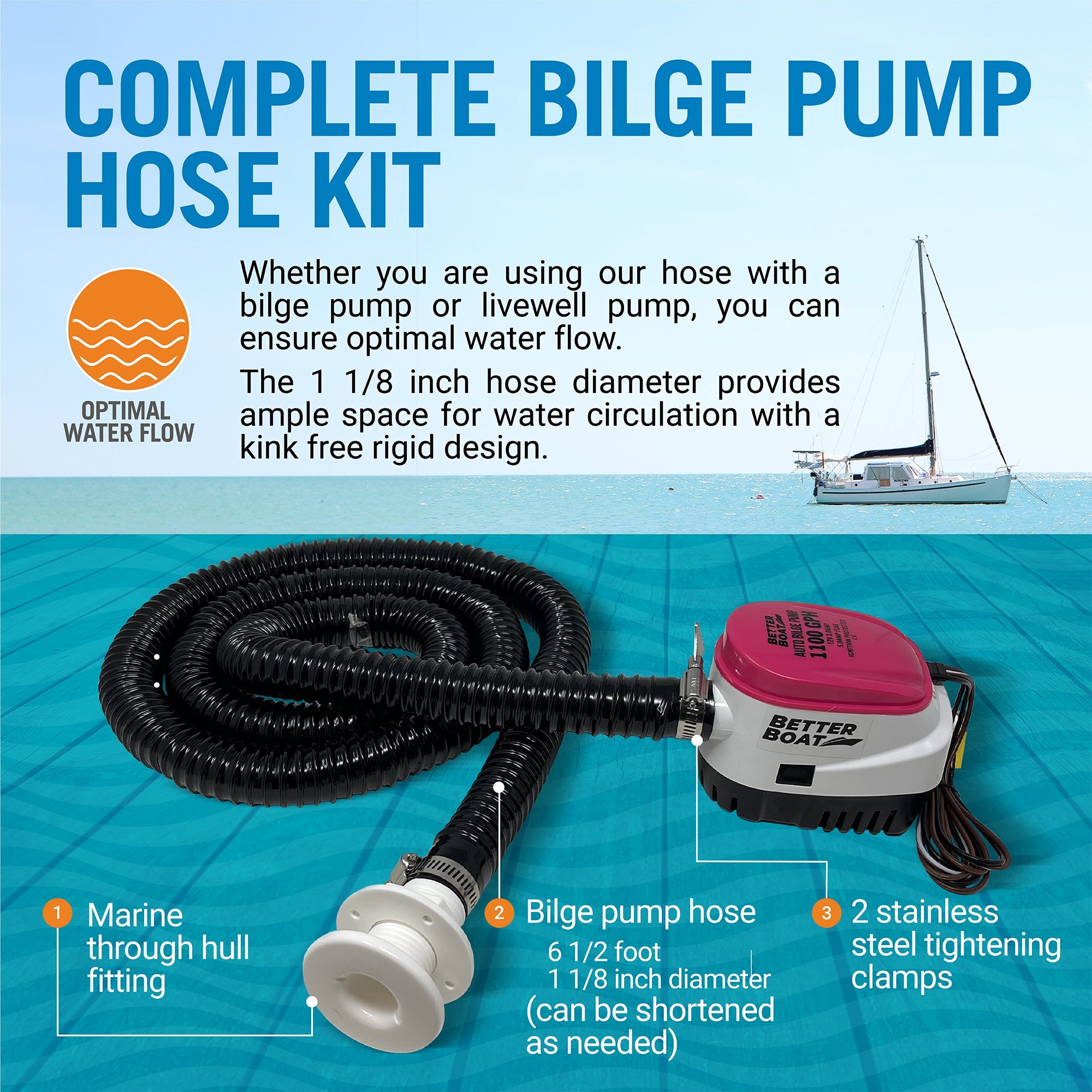 - COMPLETE BILGE PUMP HOSE KIT: Our 1 1/8 Hose Kit comes with a marine through hull fitting in white along with a 6 1/2 foot bilge pump hose 1 1/8 inch diameter that can be shortened as needed as well as 2 stainless steel tightening clamps.