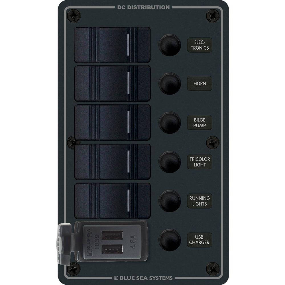 Blue Sea 8521 - 5 Position Contura Switch Panel w/Dual USB Chargers - 12/24V DC - Black