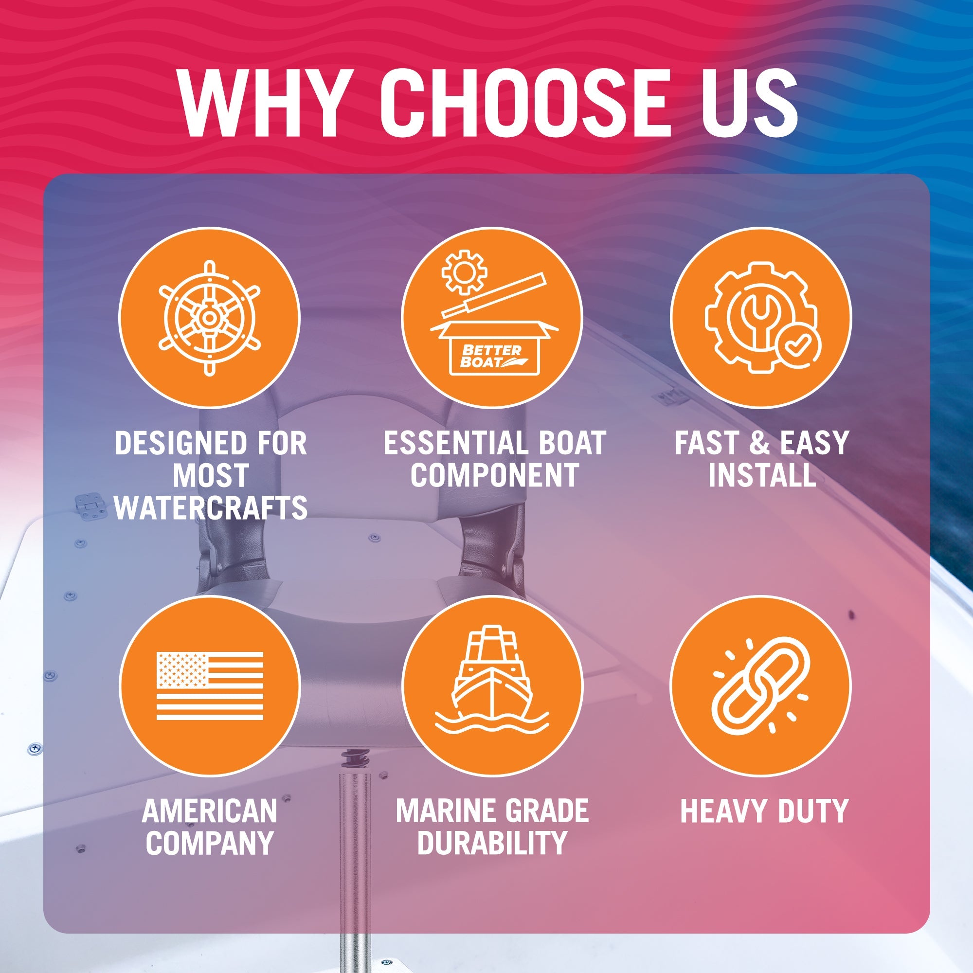 - WHY BETTER BOAT: As a family-owned American business, we are dedicated to producing premium boat care products. We guarantee your satisfaction with our swivel seat pedestals, mounting kits, and other boat seat accessories.