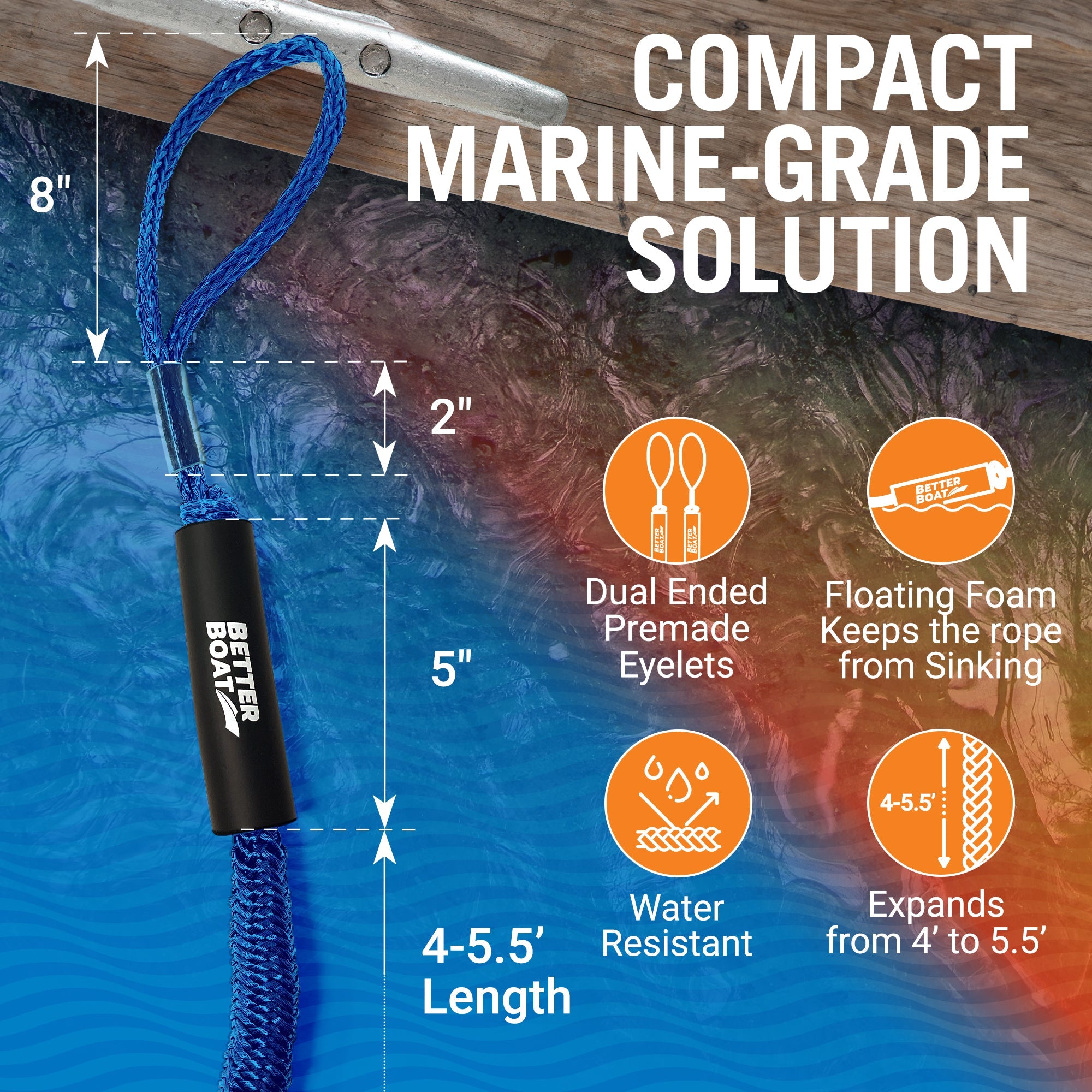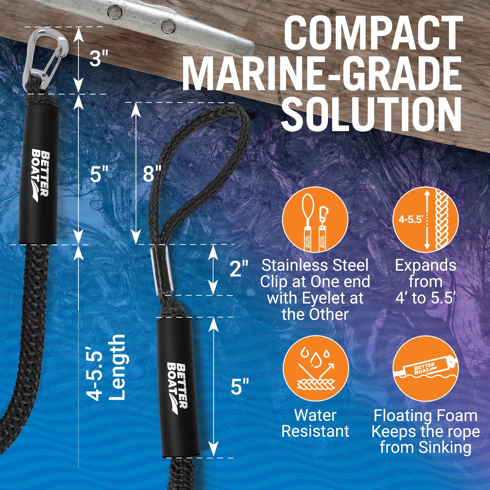 - COMPACT, EASY STORAGE DESIGN: Designed to expand from 4 feet to 5.5 feet, our bungee dock lines for boats can be neatly rolled for storage on your jet ski or boat, or left at the dock. Choose from options including a stainless steel clip or simple bungee ties for docking.