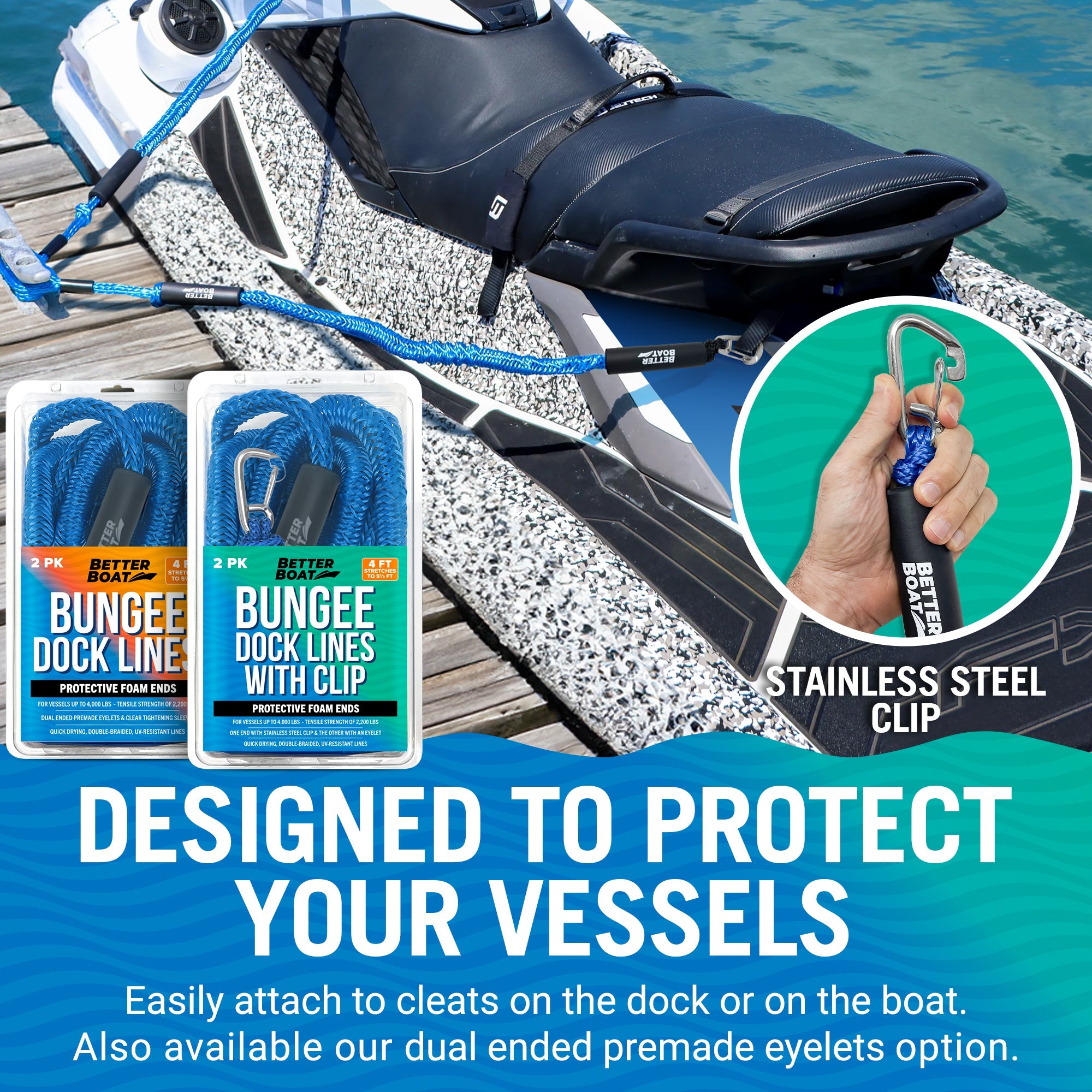 - MINIMIZE STRESS ON YOUR VESSEL: Attach our boat bungee dock line effortlessly to your dock cleats or nearby boats, allowing the ropes to stretch and recoil, thus reducing the load on both your dock and vessel. These lines offer a convenient solution for fast and easy boat or jet ski docking with an included clip.