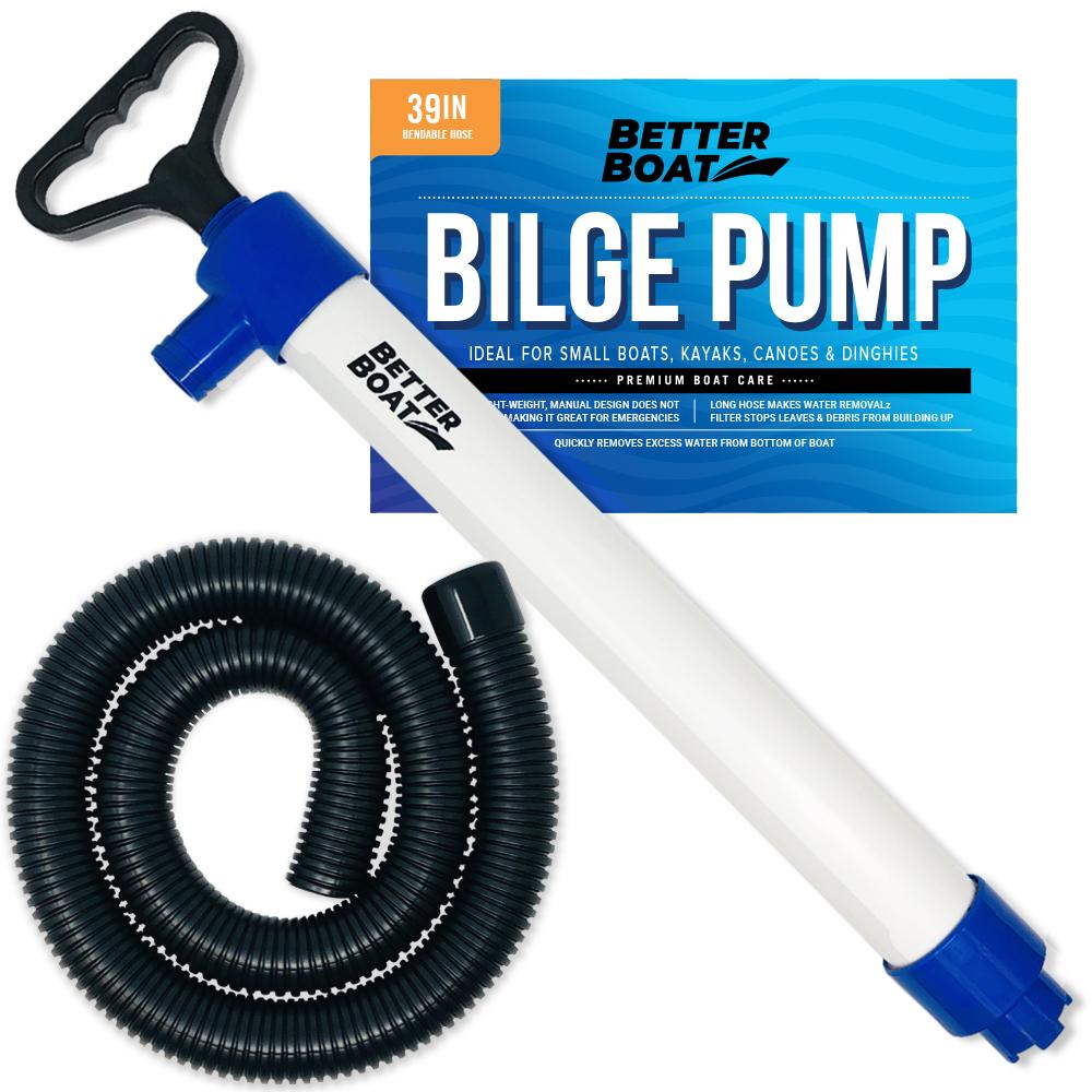 This lightweight, portable bilge pump quickly removes water from the bottom of your boat. The small size makes it easy to store when space is tight. Use this manual hand bilge pump for boats, kayaks, canoes and dinghies. Our hand bilge pump features a long hose that makes reaching the bottom of your boat easier and a filtered nozzle to prevent clogs from debris. Try the Better Boat bilge pump risk-free for 30 days - love it or get your money back!