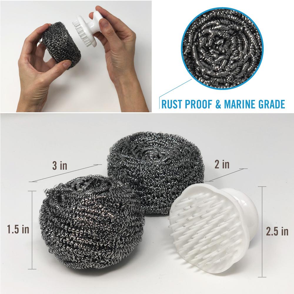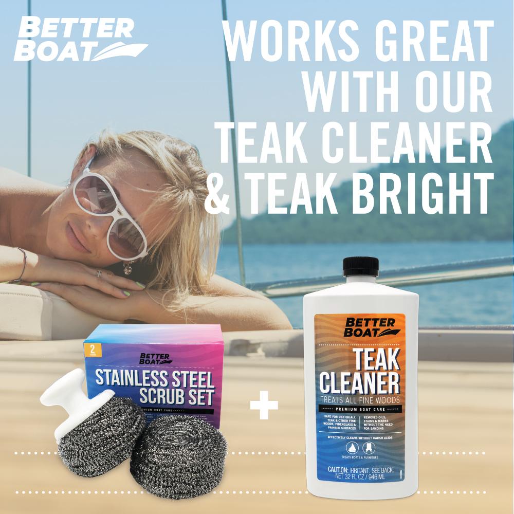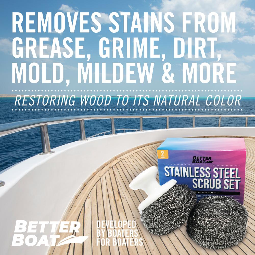 Heavy-duty stainless steel boat scrubber removes years worth of stubborn stains, embedded dirt and weathering from Teak. The long-lasting, marine-grade stainless steel won't rust, fray or wear down quickly. Works great for cleaning outdoor furniture and to remove surface rust from metal. Can also be used to scour pots and pans. Three piece set includes two stainless steel scrubber with a handle (comfort-grip). Use with our Teak Cleaner for the best looking results. Try it risk-free for 30 days, love it or get your money back!
