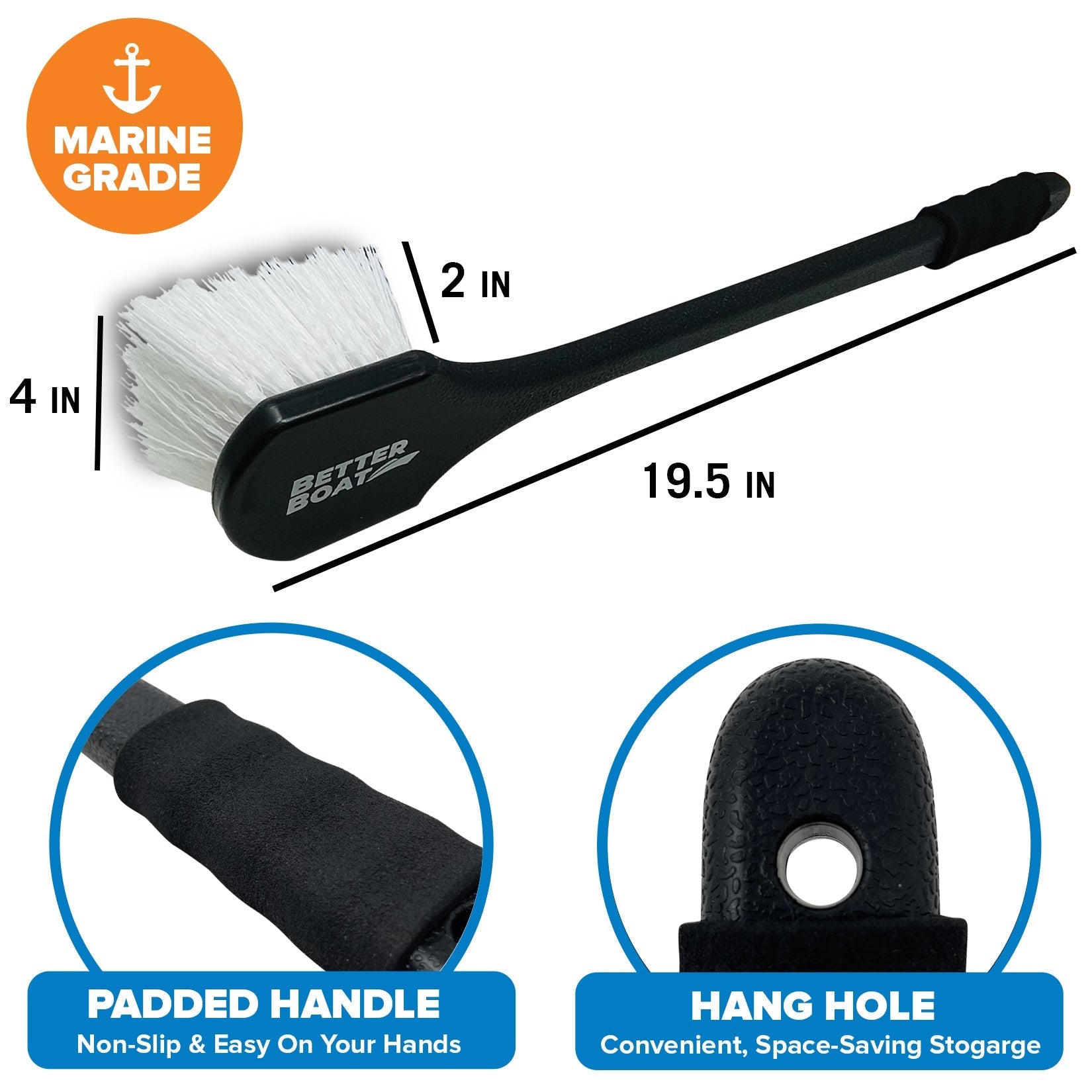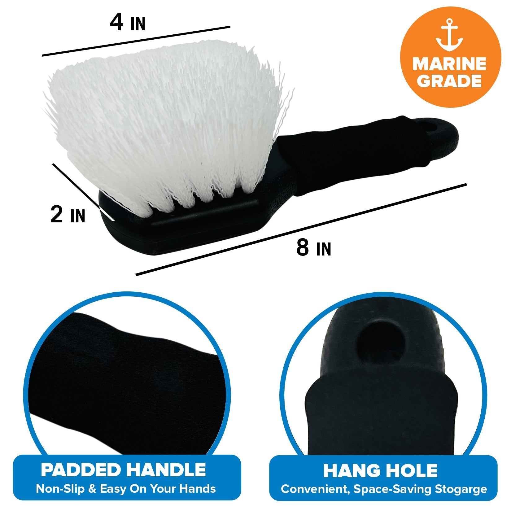Our premium marine-grade, stiff nylon scrub brush quickly breaks up grime to remove stubborn stains from surfaces with ease! It’s a great value multi-purpose cleaning brush that cuts through dirt and debris on your boat, cars and all around the home keeping surfaces spotless. The padded, ergonomic handle on our heavy-duty handheld scrub brush reduces strain on your hand and gives you outstanding grip even in wet conditions. It also features a convent hang hole design for easy storage. This multipurpose utility brush for cleaning has a wide face to cover a lot of ground quickly and make your job easier! We proudly stand behind the quality of all our products.