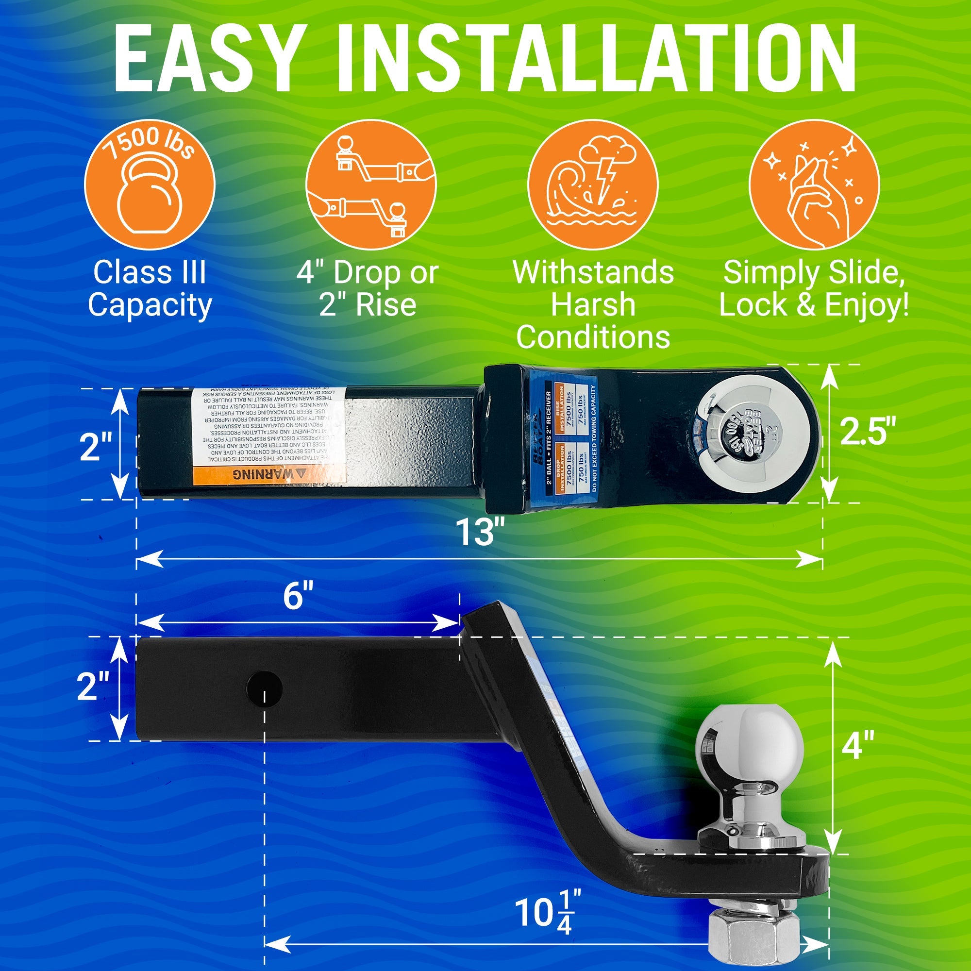 EASY INSTALLATION: Our ball hitch is ready for use. Simply tighten the ball in your desired location, slide the hitch into your 2" receiver on your truck or SUV, and secure it with the included pin. Works seamlessly with our separately sold 2-inch trailer couplers.