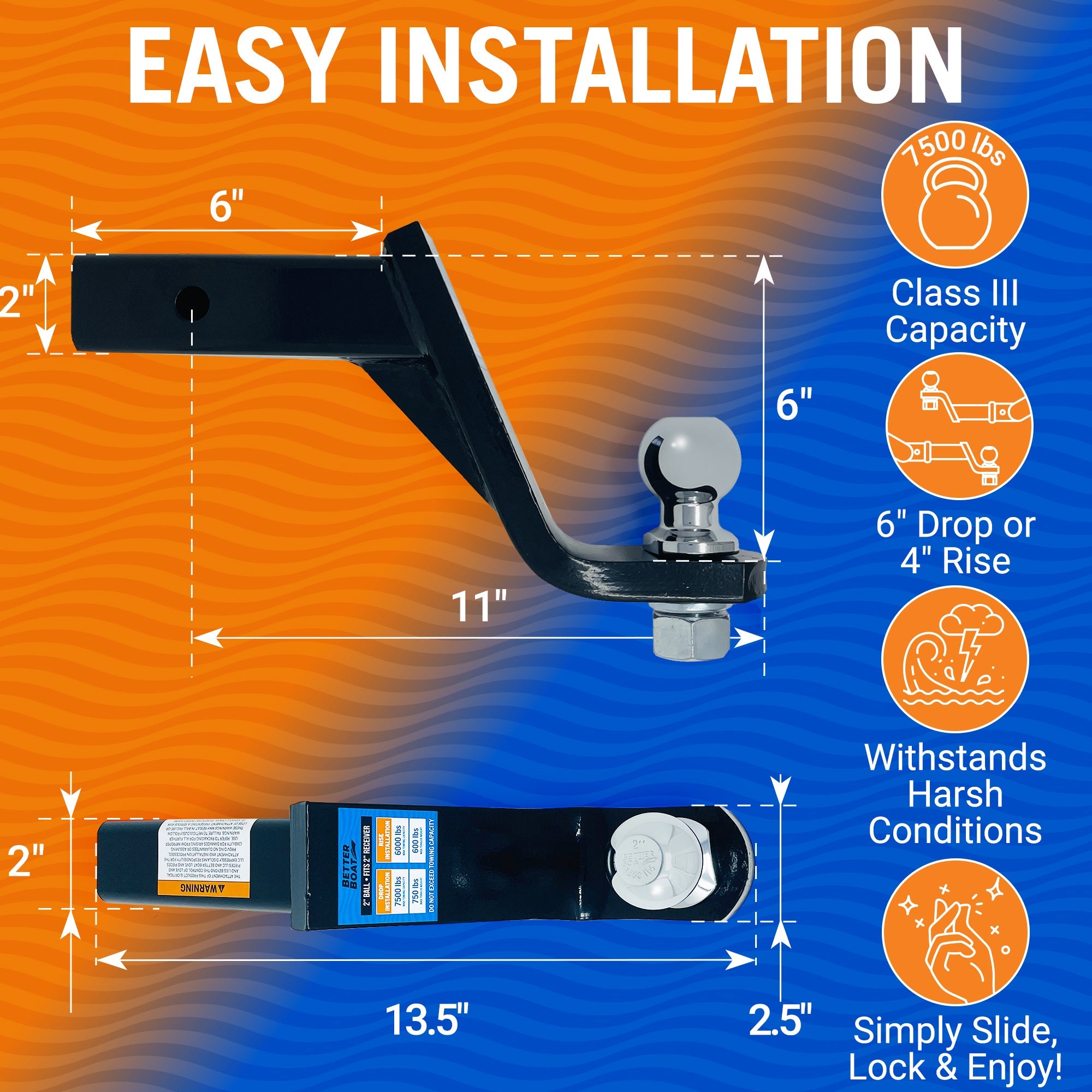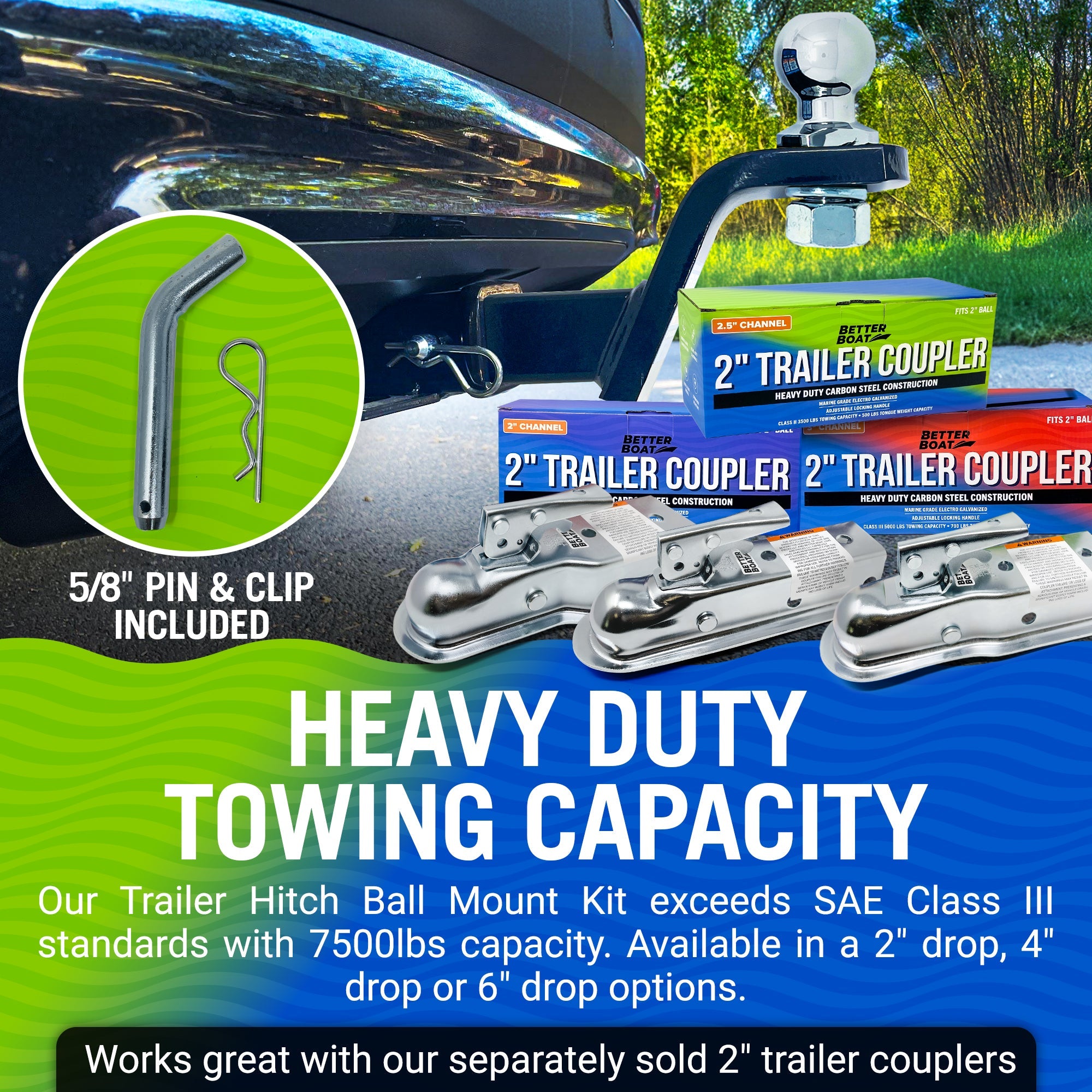 HEAVY DUTY TOWING CAPACITY: The chrome 2" ball size and 2-inch hitch mount with a 1-inch shank are designed to meet or exceed Class III standards, supporting a 7,500 lbs capacity for secure towing of your trailer, whether you choose the 2", 4", or 6" drop.