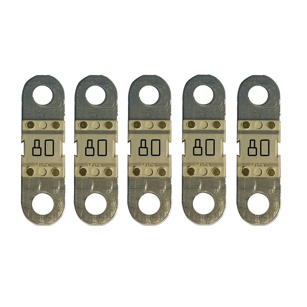 Victron Energy's MIDI fuses are essentially a smaller version of the MEGA fuses and are known to have low voltage drop and cold resistance. This particular pack of Victron MIDI fuses contains five 80 amp fuses.