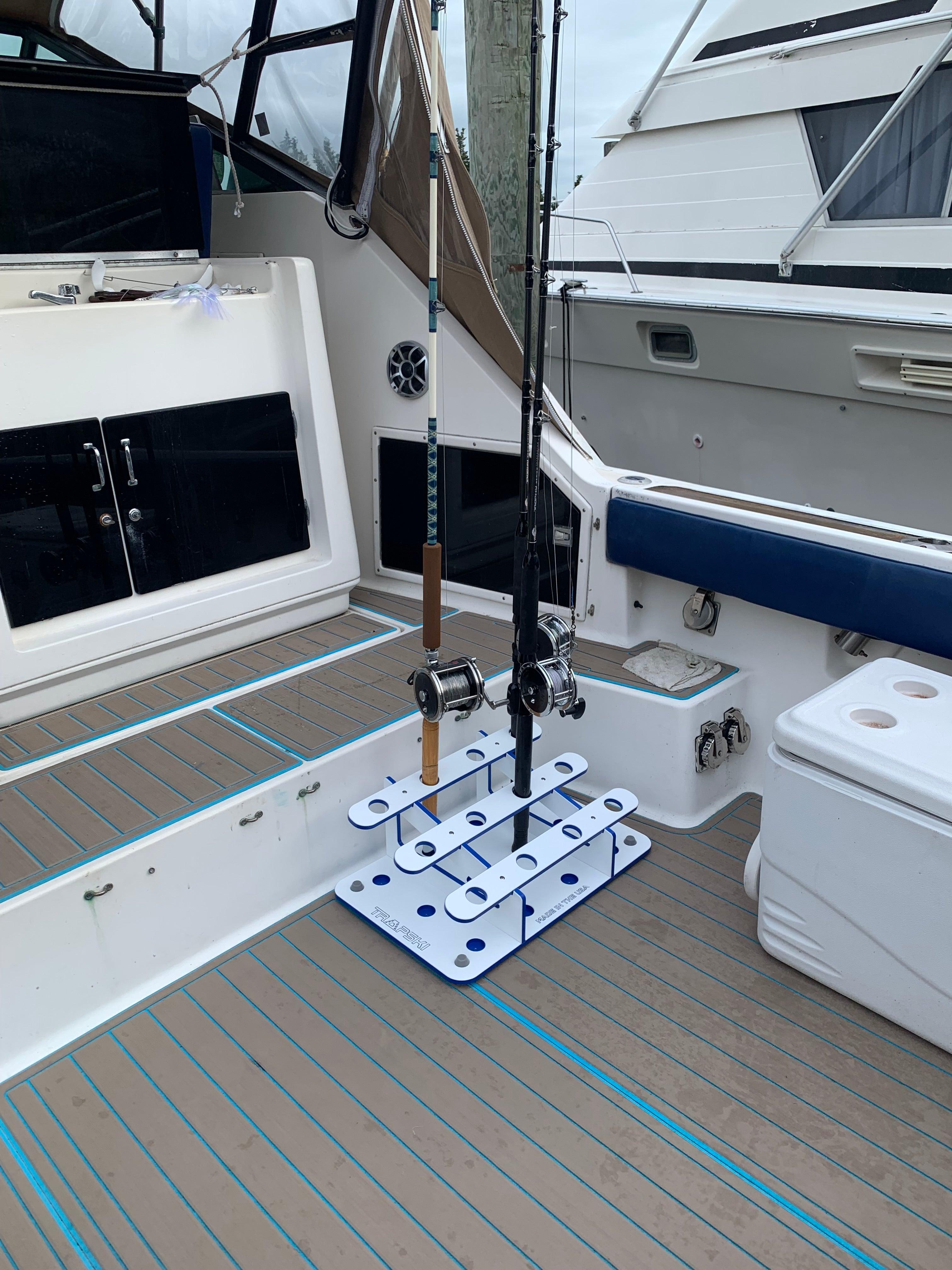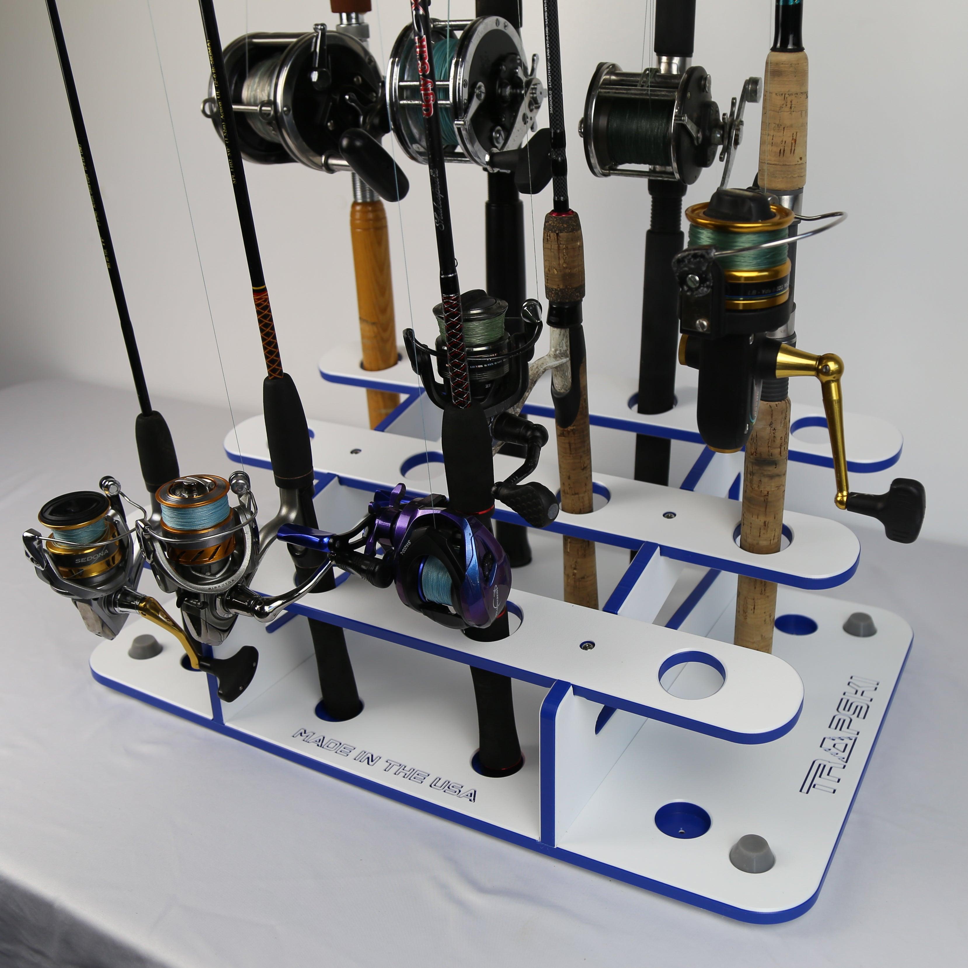 - The rack has 1.5 inch holes and a tiered system that can hold small freshwater fishing poles, inshore rods and deep sea rods with extra large butt ends.