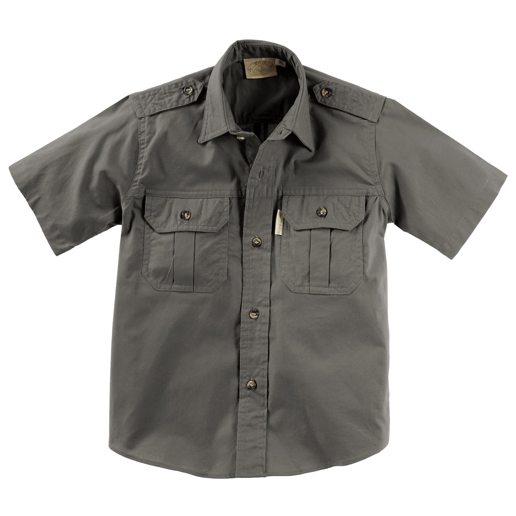 Trail shirt for kids in short sleeves, is a classic outdoor shirt and perfect for activities with the whole family. Two chest pockets with button down flaps carry essential outdoor gear. Functional cross-stitched epaulettes prevent a camera or water bottle from slipping off the shoulder. A double layered back yolk gives extra sun protection, while two back tucks allow extra shoulder swing. Double stitched throughout for durability, with generous sizing and long tails that stay tucked in. Made in Africa from pre-washed and pigment dyed 5 1/2 ounce cotton for a natural worn look. This kid’s short sleeve safari trail shirt will be a welcome travel companion on any adventure.