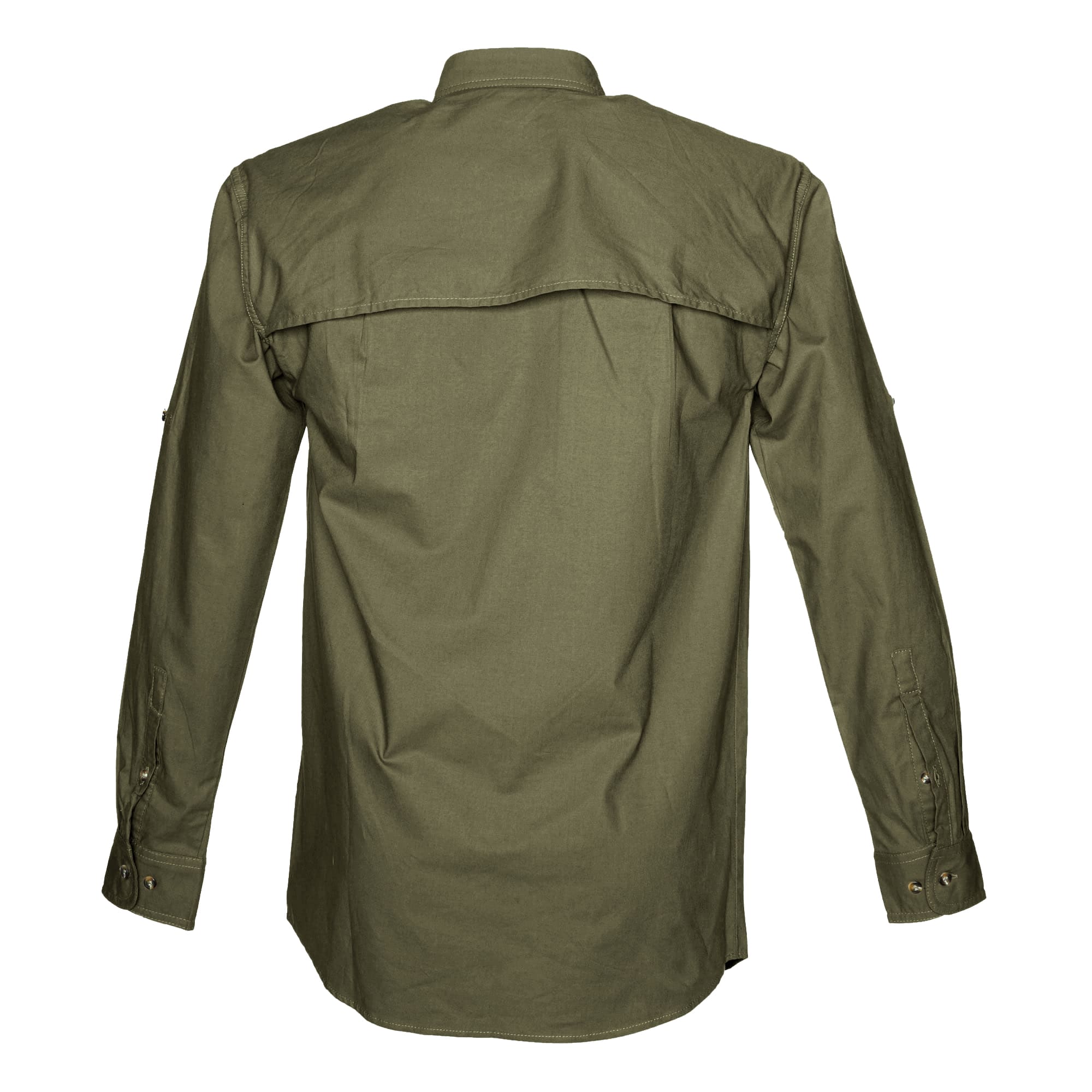 Vented Back Adventure Safari Shirt for men in long sleeves is the ideal safari shirt for your African outdoor travel experience. The mesh lined vent back circulates air to keep you cool. Two chest pockets with button down flaps carry essential outdoor gear. Safari style roll up tabs add a classic finishing touch to the sleeves. Button down collars stop the wind from blowing collar points in your face. Double stitched throughout for durability, with generous sizing and long tails that stay tucked in. Made in Africa from 5 1/2 ounce pre-washed and pigment dyed cotton for a natural worn look.