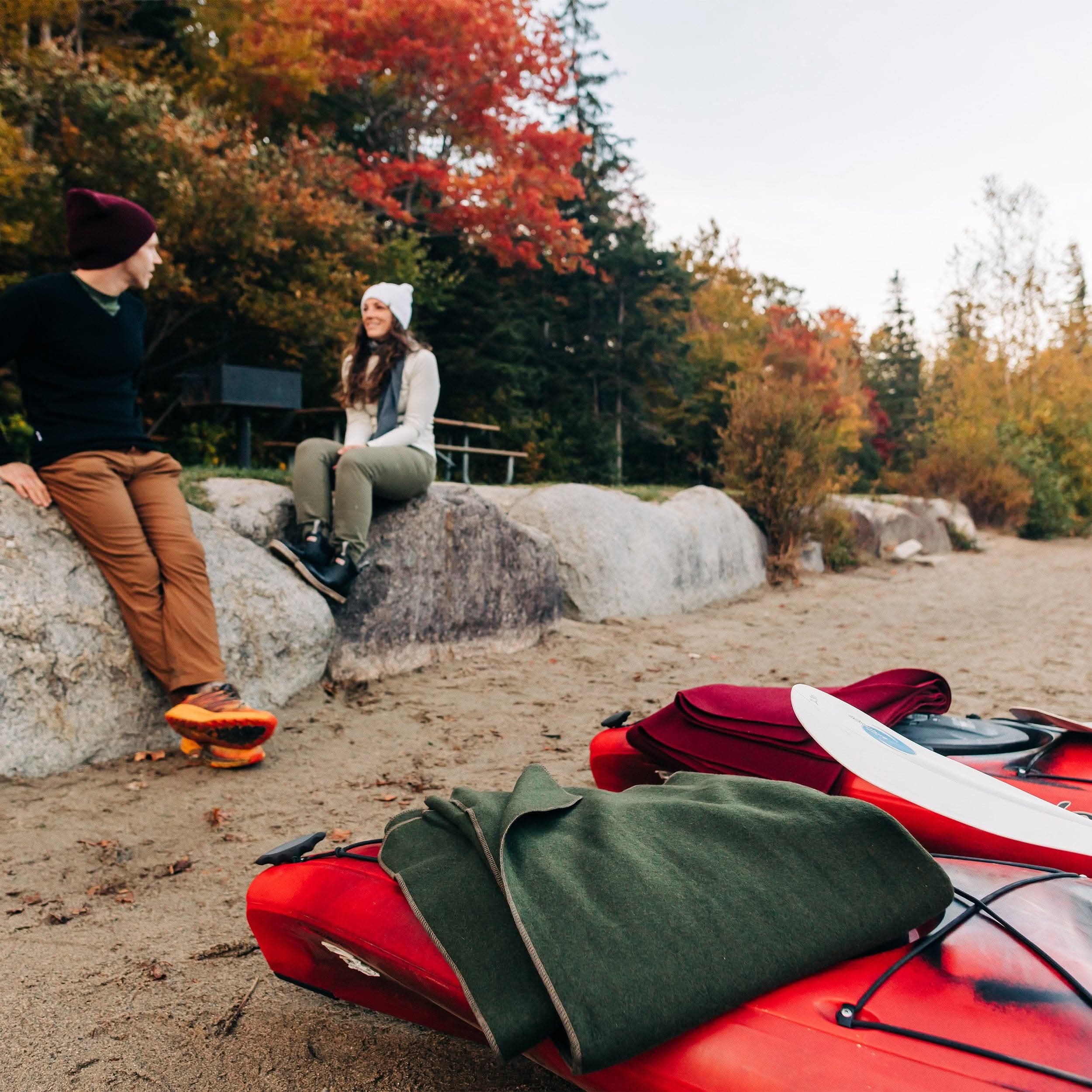 We now have an 80% recycled wool Lodge Blanket! The second product in our White Mountain Collection, this blanket has all the same features and qualities as the original White Mountain Woolen Camp Blanket with a higher recycled wool content and bigger size. This collection comes in buffalo plaid and solid colorways. Use this oversized blanket as a picnic blanket, or take it along on your hiking, camping, tailgating, or fishing adventures. Made up of recycled wool, this product has fire-resistant properties so you don't have to worry about it catching fire from sitting at a campfire. Bring this to camp and throw it on your bunk bed for a cozy night of sleep! Size: 65in x 90in, about normal twin blanket size.