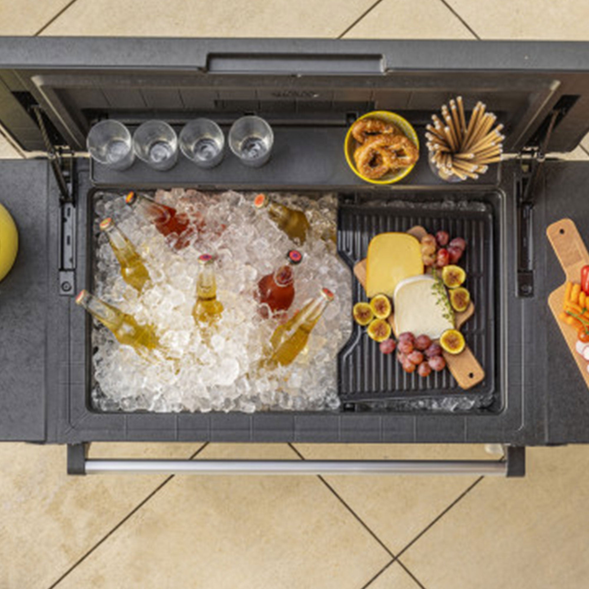 Get virtually everything you need for your next backyard shindig in a sleek and compact unit with the Outdoor Rolling Patio Cooler and Beverage Cart from Keter.