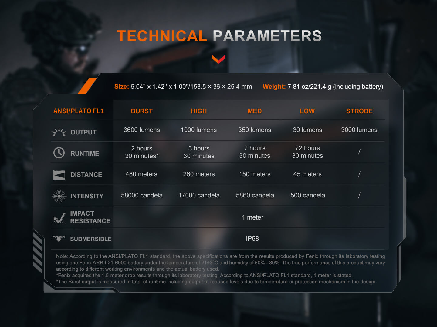 Crafted for duty use, the flashlight boasts rugged IP68 waterproofing and 1.5-meter drop resistance. Intelligent overheat protection preserves internal components during extended use, and the included 6000mAh 21700 rechargeable battery ensures lasting performance on the job.