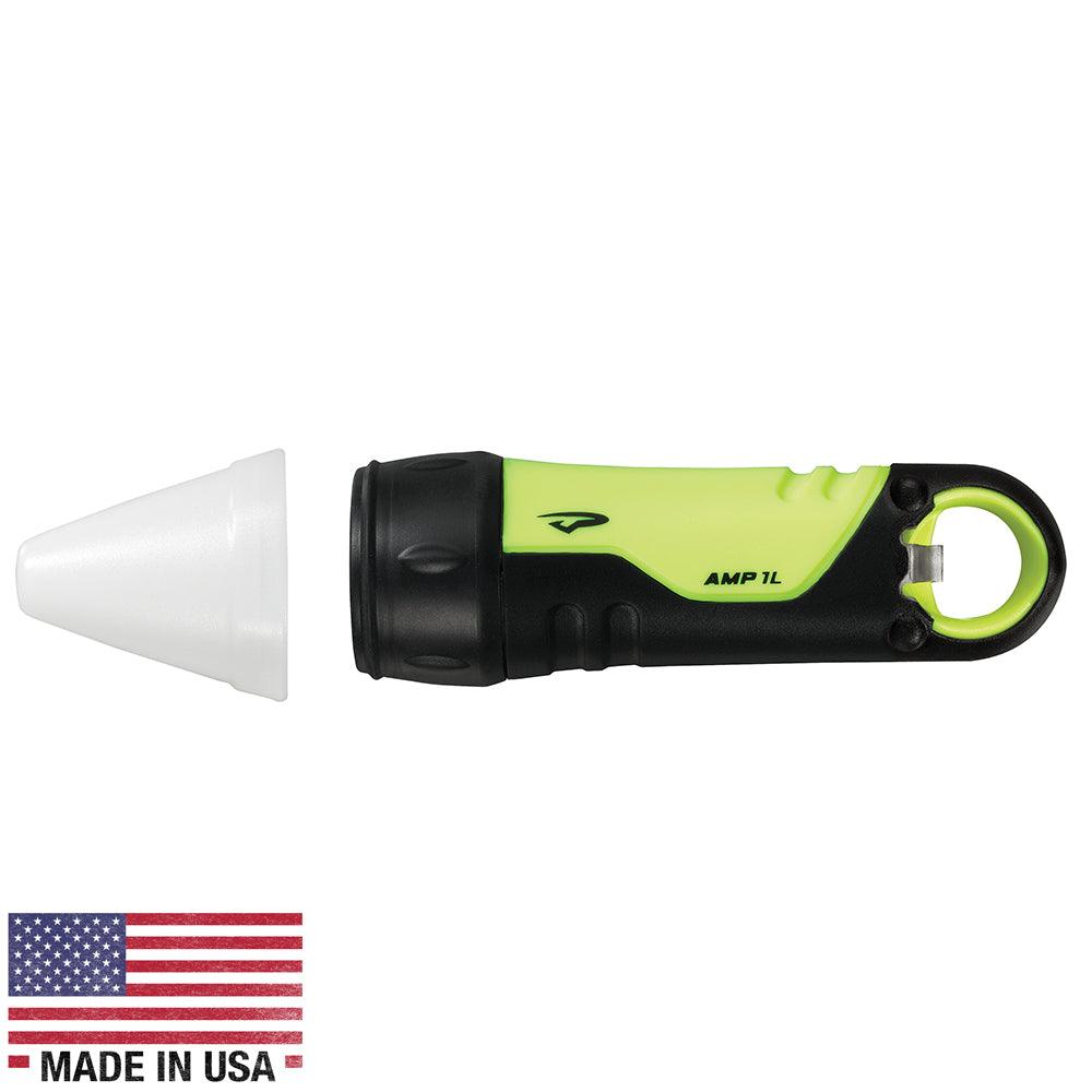 Waterproof to 100M (330ft) and equipped with a large carabiner loop, this handheld light is ready for any conditions and easy to clip onto gear. The Amp 1L comes with a snap on translucent cone to turn it into a marker light, hanging lantern or area light.