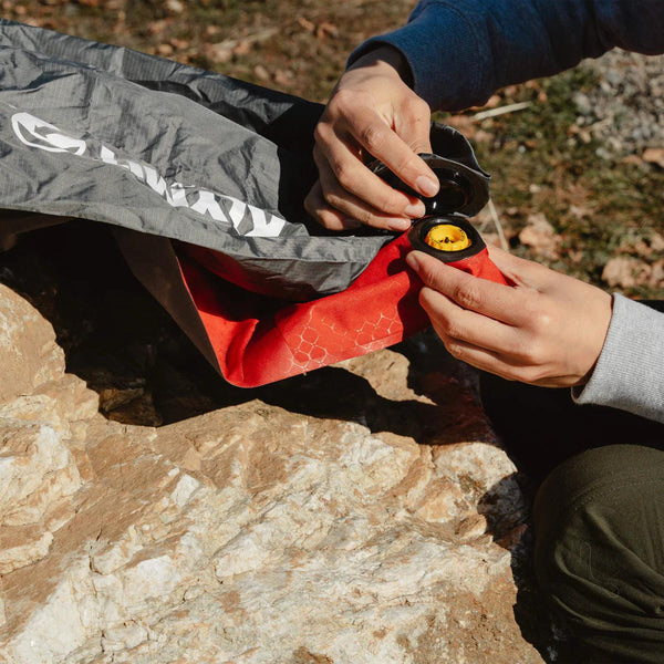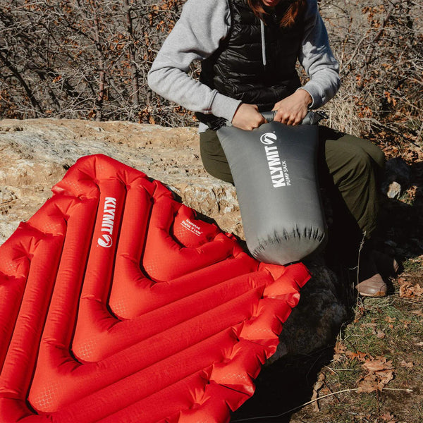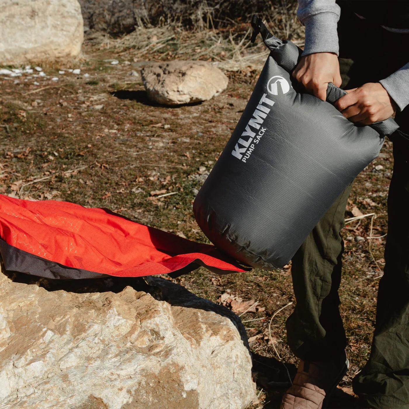 The Klymit Pump Sack (20L) is an effortless roll top pump for your sleeping pad. Using a pump instead of your lungs to inflate your product reduces the condensation in your sleeping pad and assists in quickly and efficiently setting up your camp. Simply snap the pump to your pad's valve, catch air in the pump, and roll the pump towards the valve to push air into the pad. Plus, the Pump Sack can double as a stuff sack for your sleeping pad or other gear. Compatible with the Klymit FLIP VALVE.