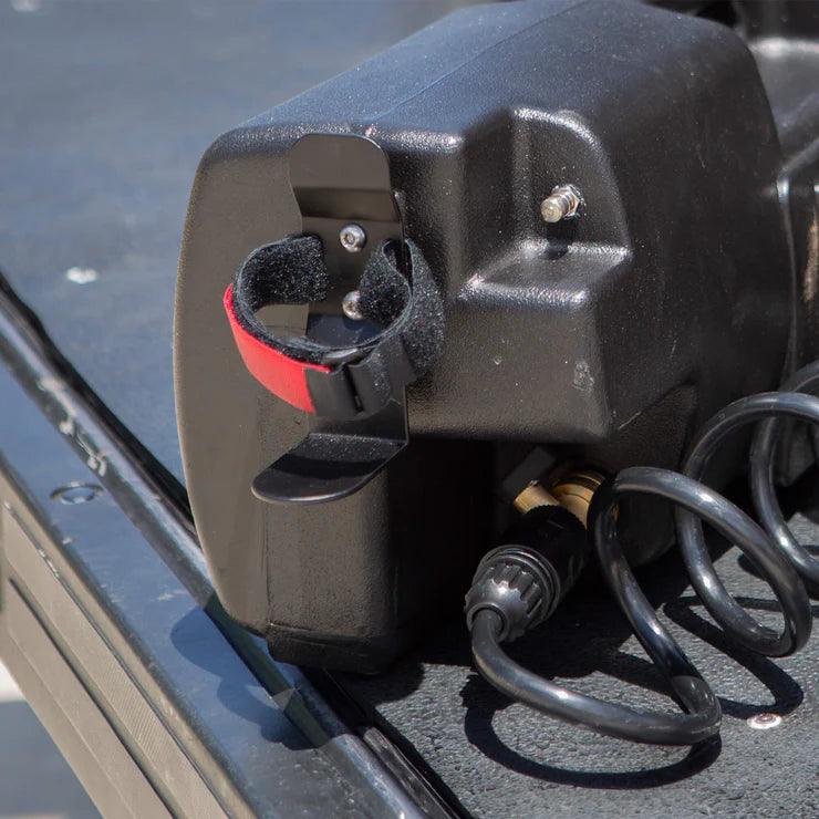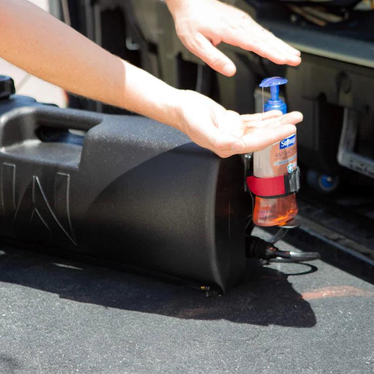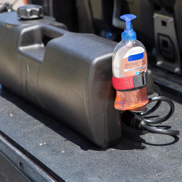 Meet WaterPORT™'s newest attachment, the Soap Holder. Our engineered stainless-steel L-bracket allows you to carry most sizes of soap bottles wherever your 4 Gallon Day Tank or 2 Gallon GoSpout may take you. Simply set the soap bottle on the foot of the L-bracket and securely fasten it using the included Velcro strap.