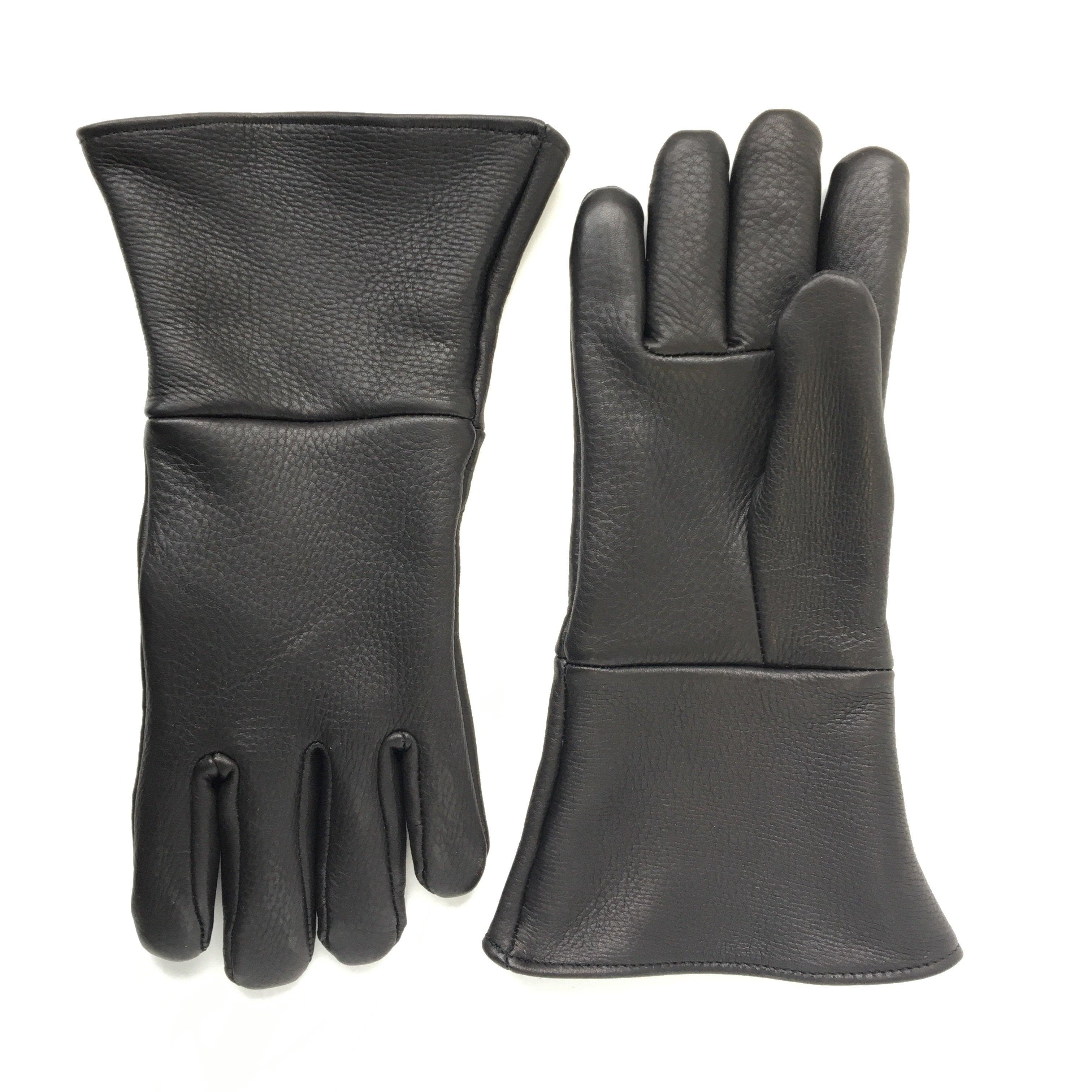 Soft, but heavy American elk. Elk has a beautiful grain finish and requires very little maintenance. Very good abrasion resistance and tolerates moisture well. The gauntlet extended cuff goes over your jacket for a warmer, more comfortable ride. All purchases are cut and hand sewn to order. Please allow two weeks for product to ship! All leathers come from natural hides which may contain scarring, giving each pair its own character.