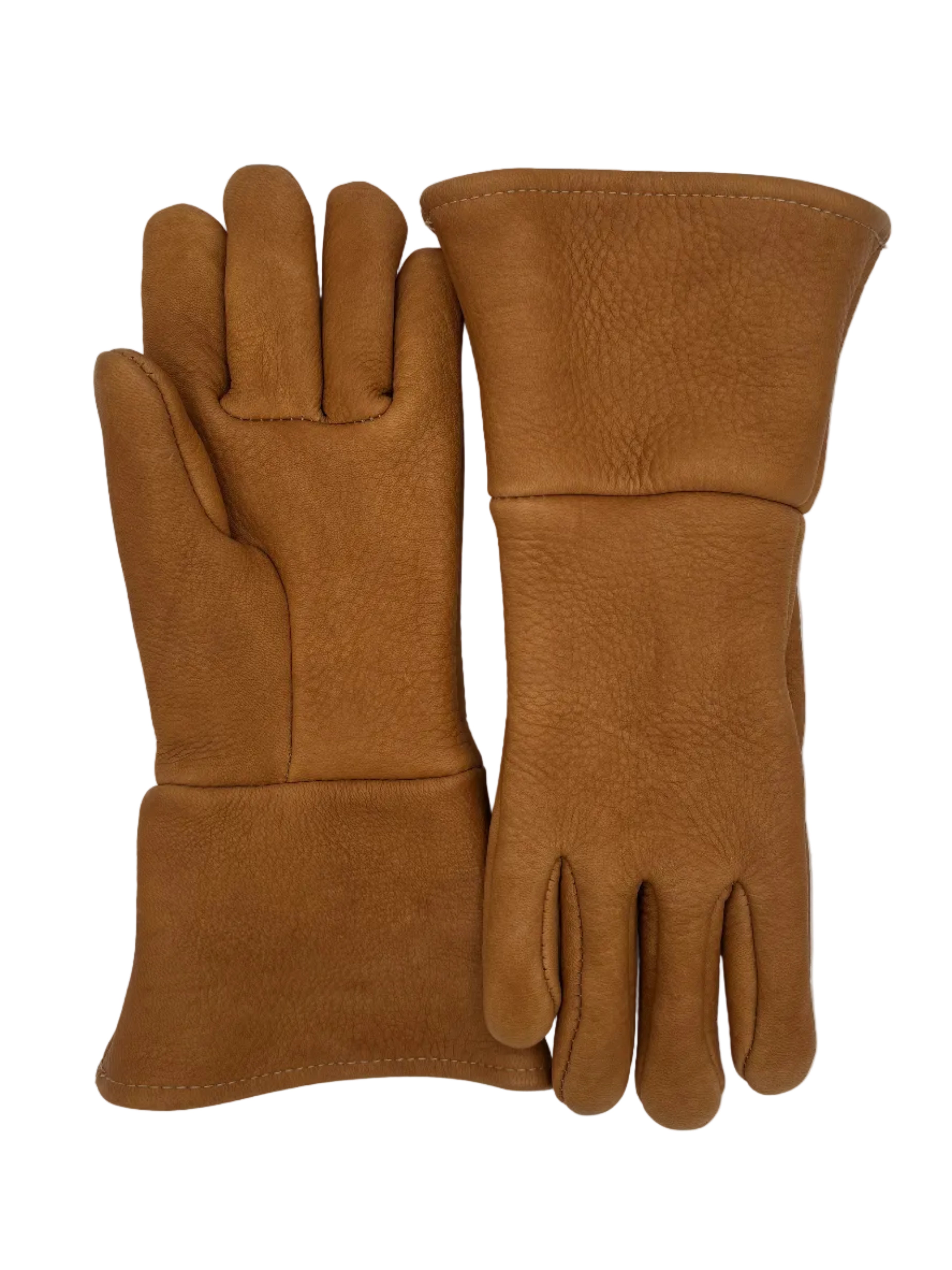 Soft, but heavy American elk skin. Elk skin has a beautiful grain finish and requires very little maintenance. Very good abrasion resistance and tolerates moisture well. The gauntlet extended cuff goes over your jacket for a warmer, more comfortable ride. All purchases are cut and hand sewn to order. Please allow two weeks for product to ship! All leathers come from natural hides which may contain scarring, giving each pair its own character.
