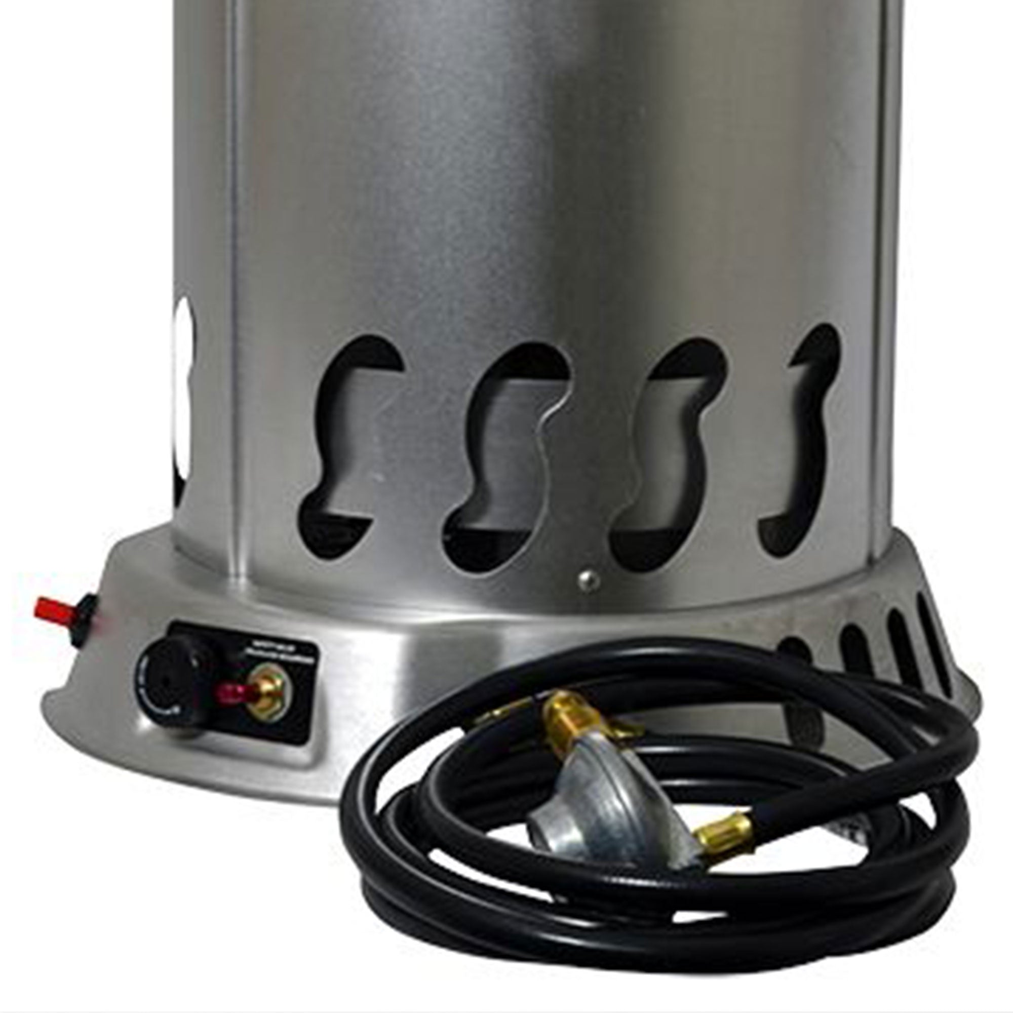 - Portable heater is powered by liquid propane and can heat up to 5,000 square feet of outdoor spaces