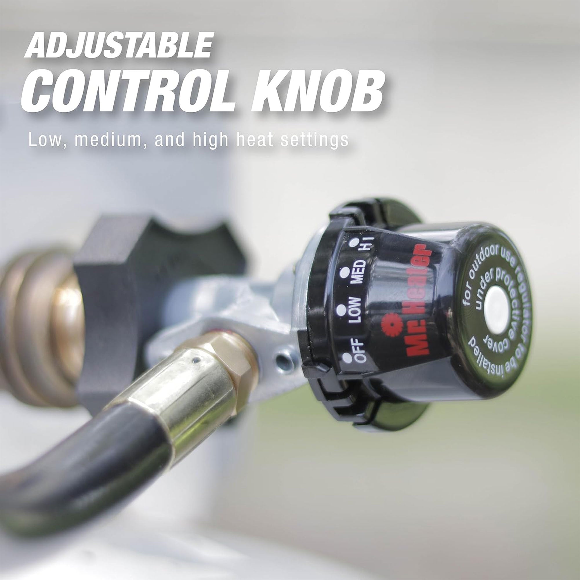 • Adjust heat levels effortlessly with the adjustable control knob, featuring low, medium, and high settings ranging from 8,000 to 30,000 BTUs