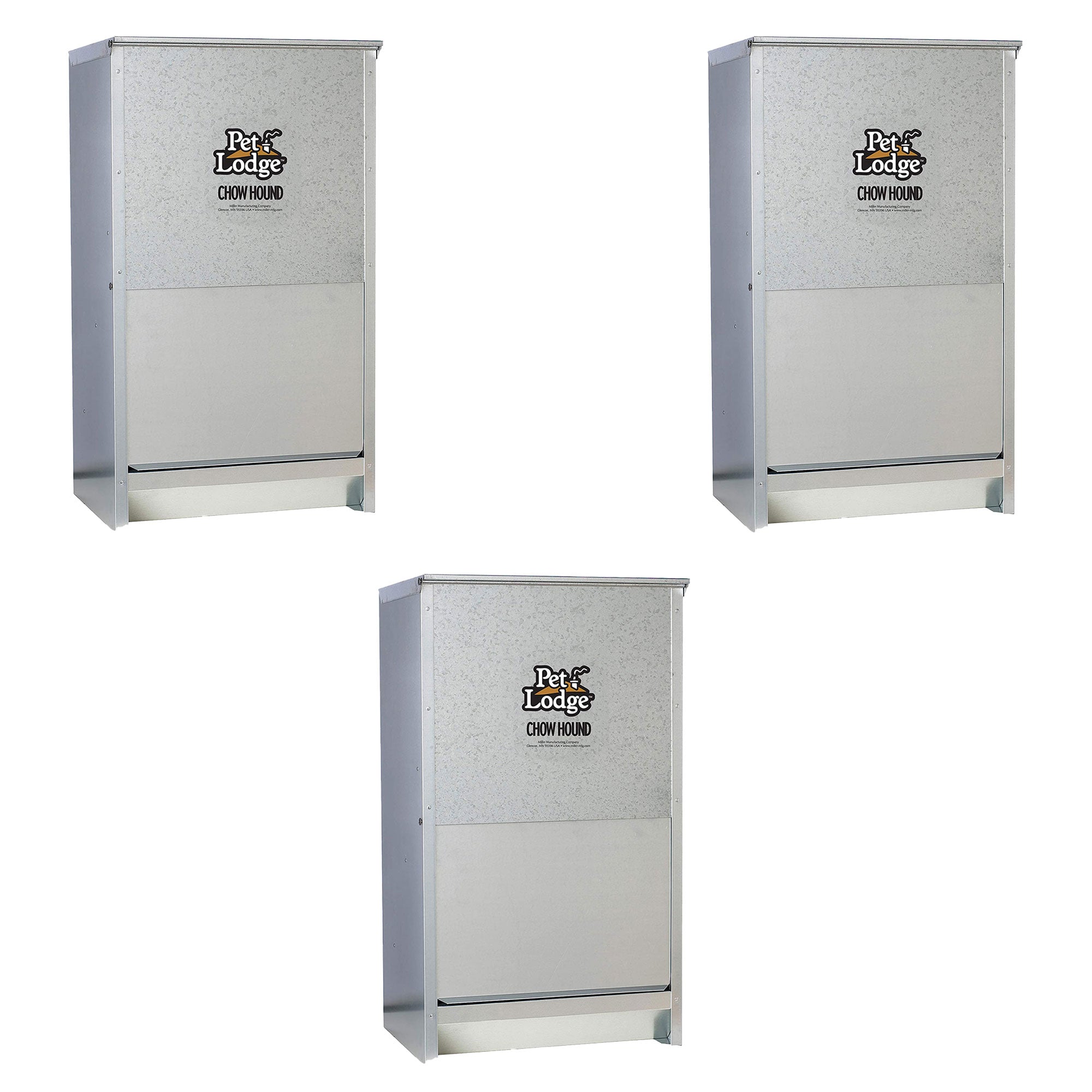 You and your dog never had this easy. Safely store dry dog food and feed it from the same chew-proof container. The Chow Hound Automatic Dog Feeder is manufactured from tough galvanized steel for durability and rust resistance. The magnetized door stays shut until your dog nudges it open, keeping unwanted pests out. A specially angled chute provides a steady food flow on demand. Food stays fresh, dry, and pest free. The feeder can be mounted on a wall by the backside keyholes or frame (not included). The 3- pack Automatic Pet Feeder comes fully assembled and can hold 50 pounds of dry dog food.