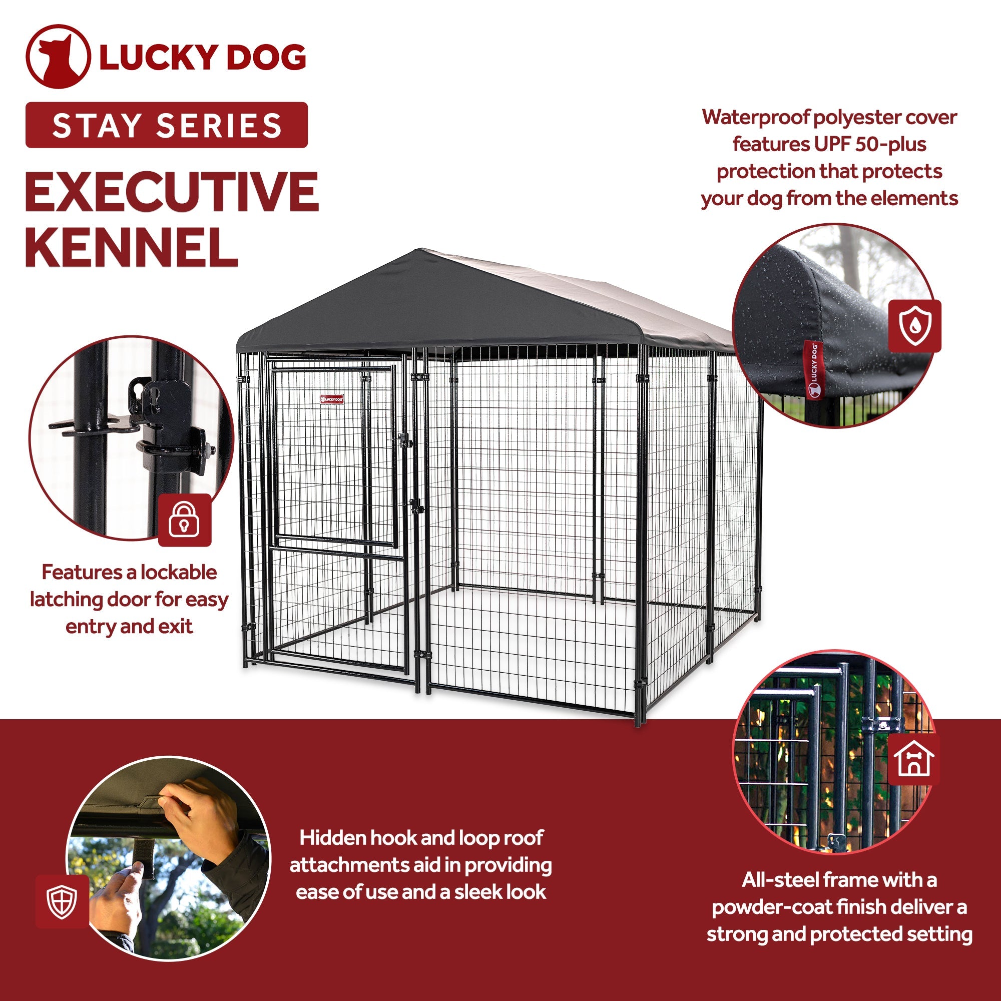 Give your dog the very best. With sleek style and durable design, the Lucky Dog STAY Series Kennel is built with a long-lasting frame and premium roof cover.