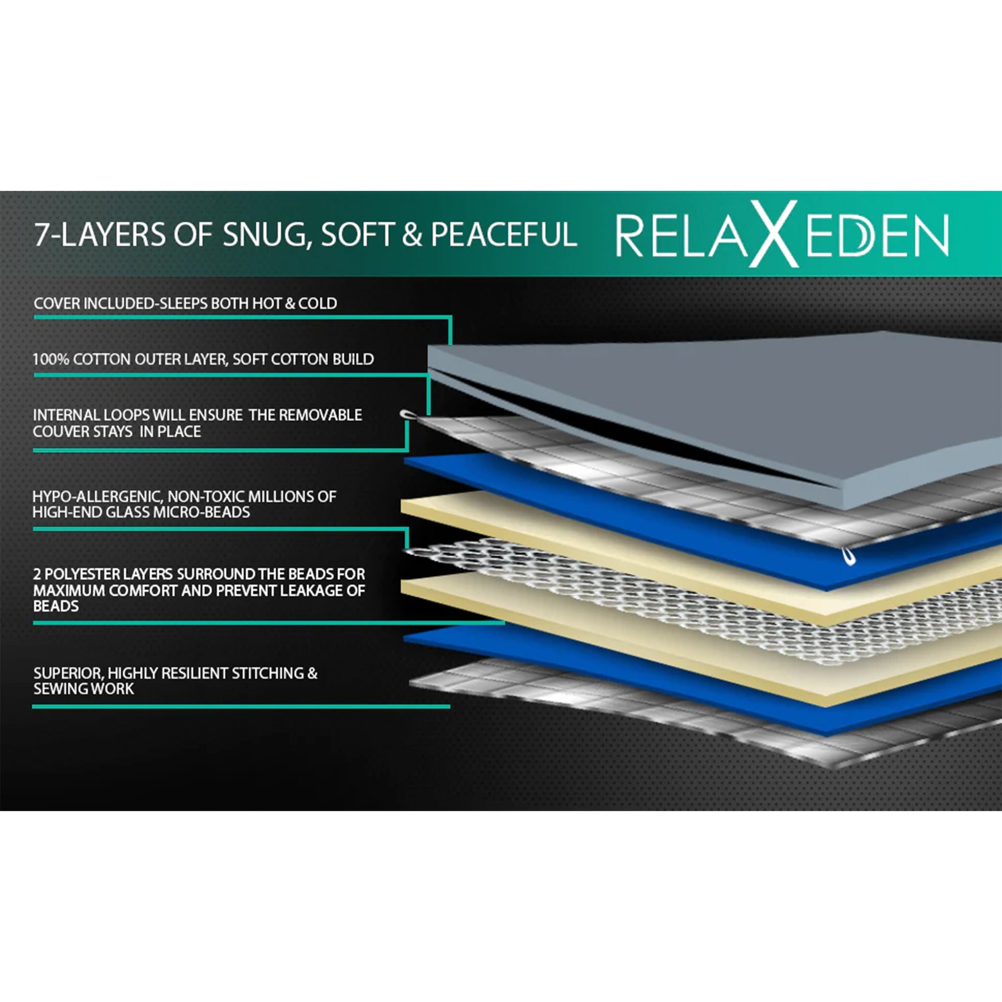 • The 2 polyester layers that surround the high-end glass micro-beads ensure comfort and prevent leakage of beads