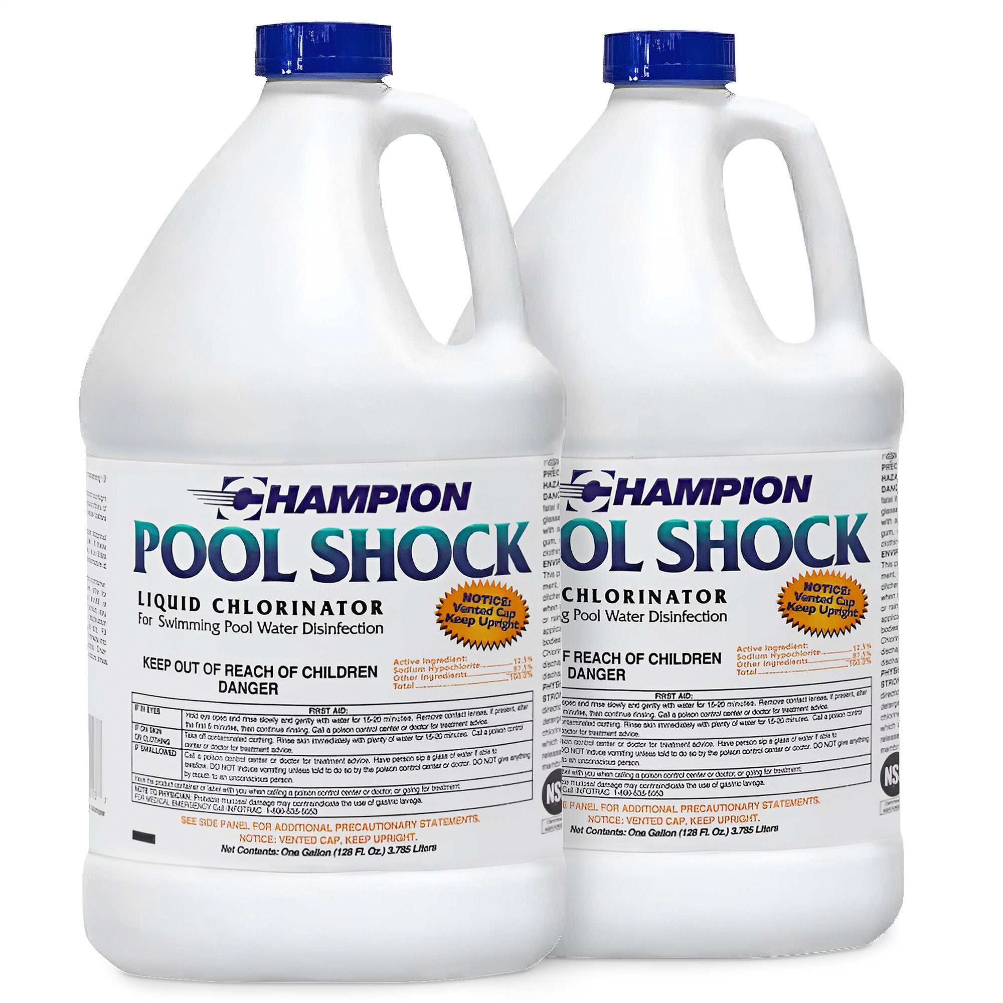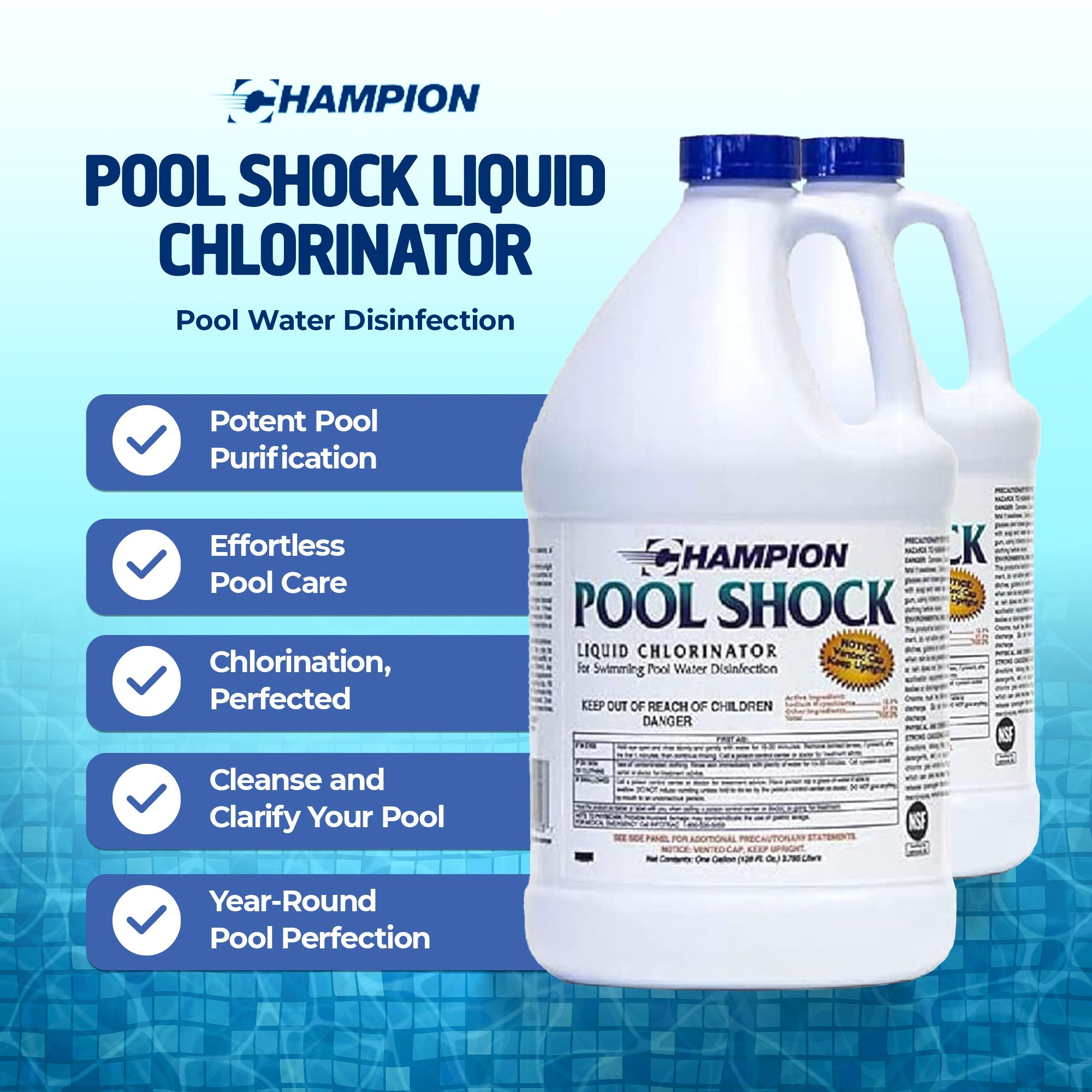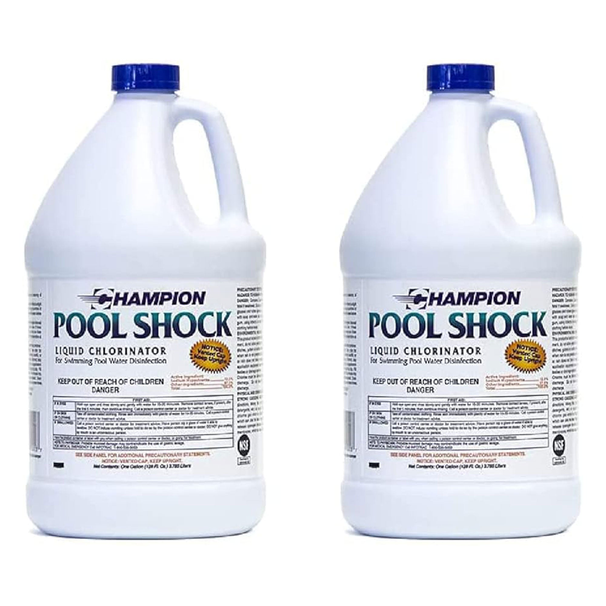 Designed for maximum convenience, the Champion Liquid Chlorinator requires no mixing; it's ready to use straight from the jug. Certified to NSF/ANSI 60 standards, rest assured that you're employing a product of the highest quality. Follow the precise dosage of 11 ounces per 10,000 gallons and watch as your pool transforms into a haven of clarity and purity with the 2-pack Champion Liquid Chlorinator.