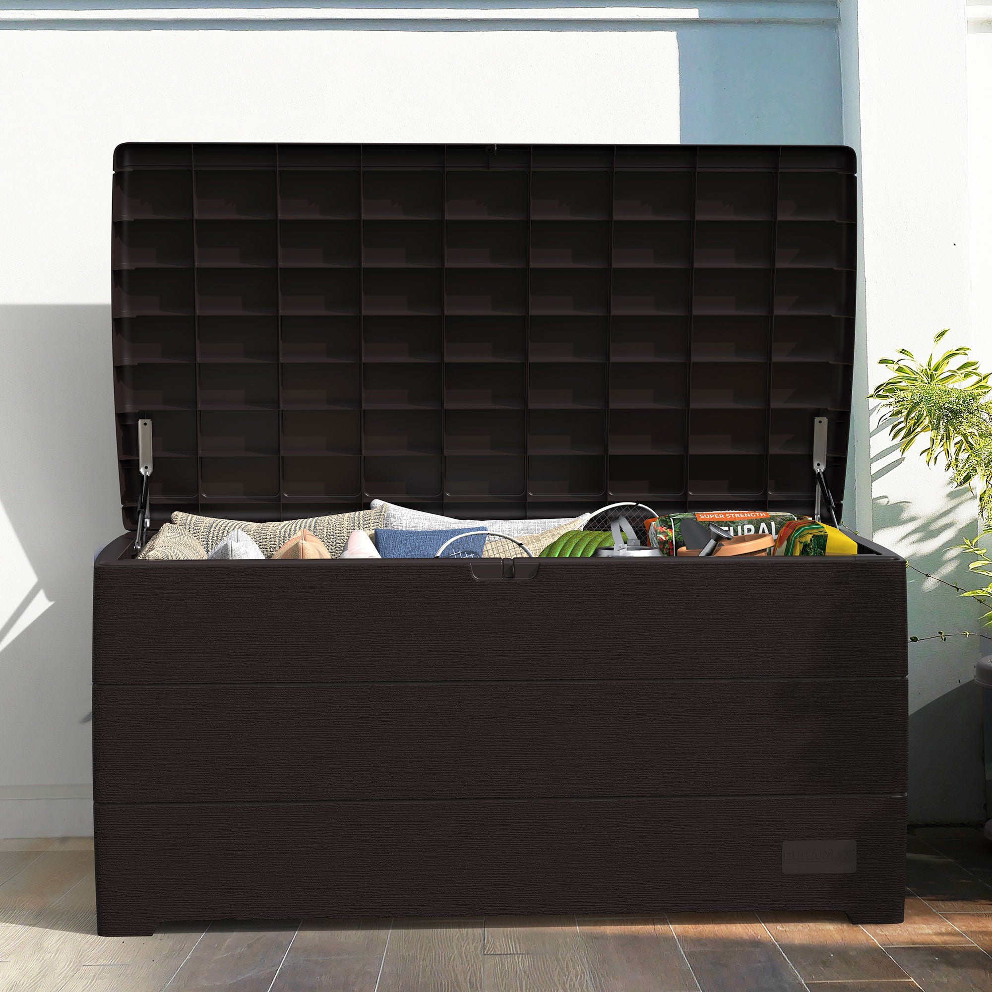 This heavy-duty deck storage box also doubles as a bench that can comfortably sit up to 2 people, providing a fantastic balance of form and function that elevates your space. Easy to assemble without tools and maintenance-free, this deck box provides a clean, secure, safe space for you to store outdoor items during inclement weather or the off-season. Offering a generous 110-gallon storage capacity, you'll have plenty of space to keep your outdoor pillows, pool equipment, gardening tools, and decorations tucked away neatly.