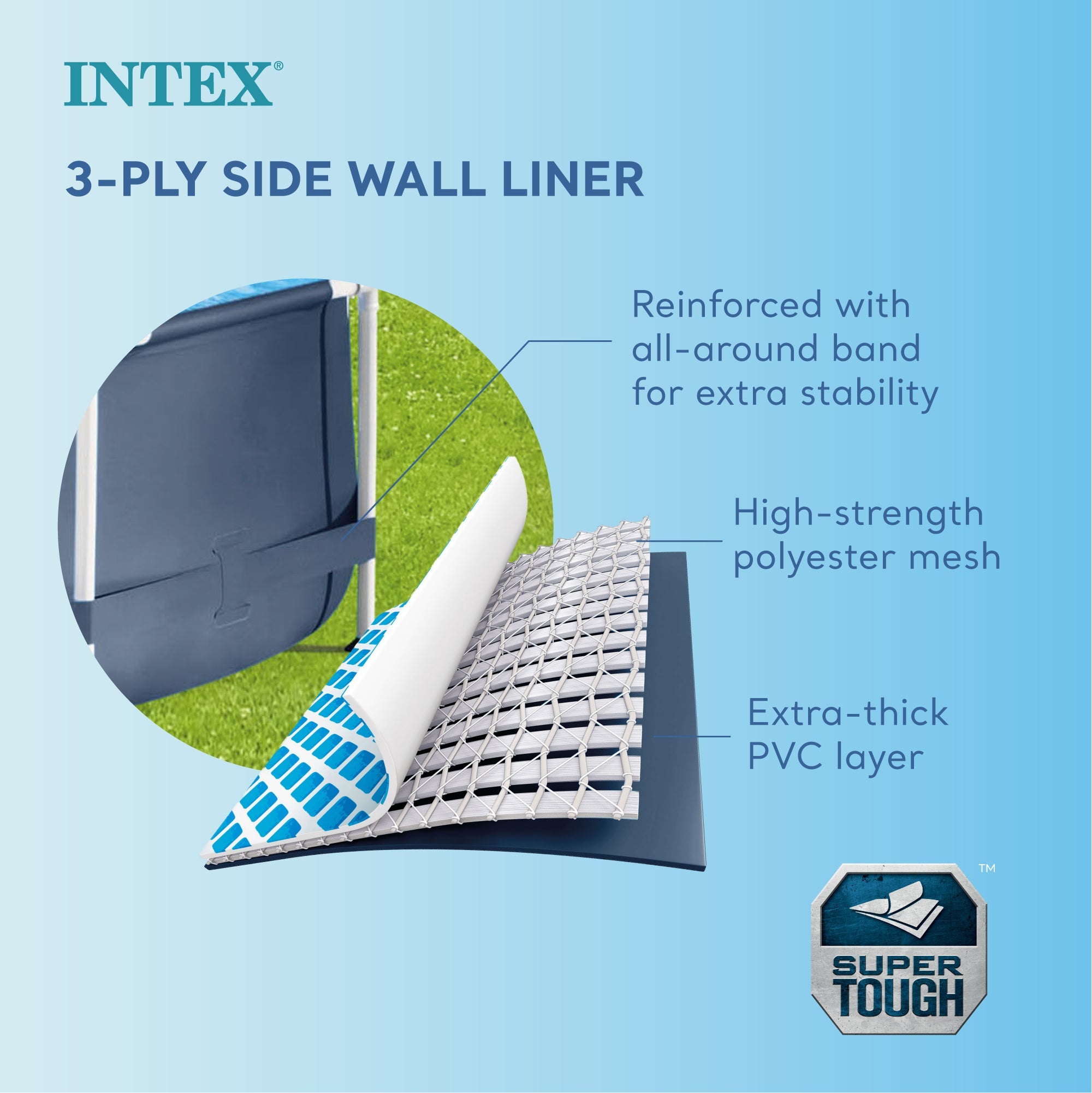- Galvanized steel frame design with tough 3-ply PVC liner optimizes shape and weight distribution for enhanced durability