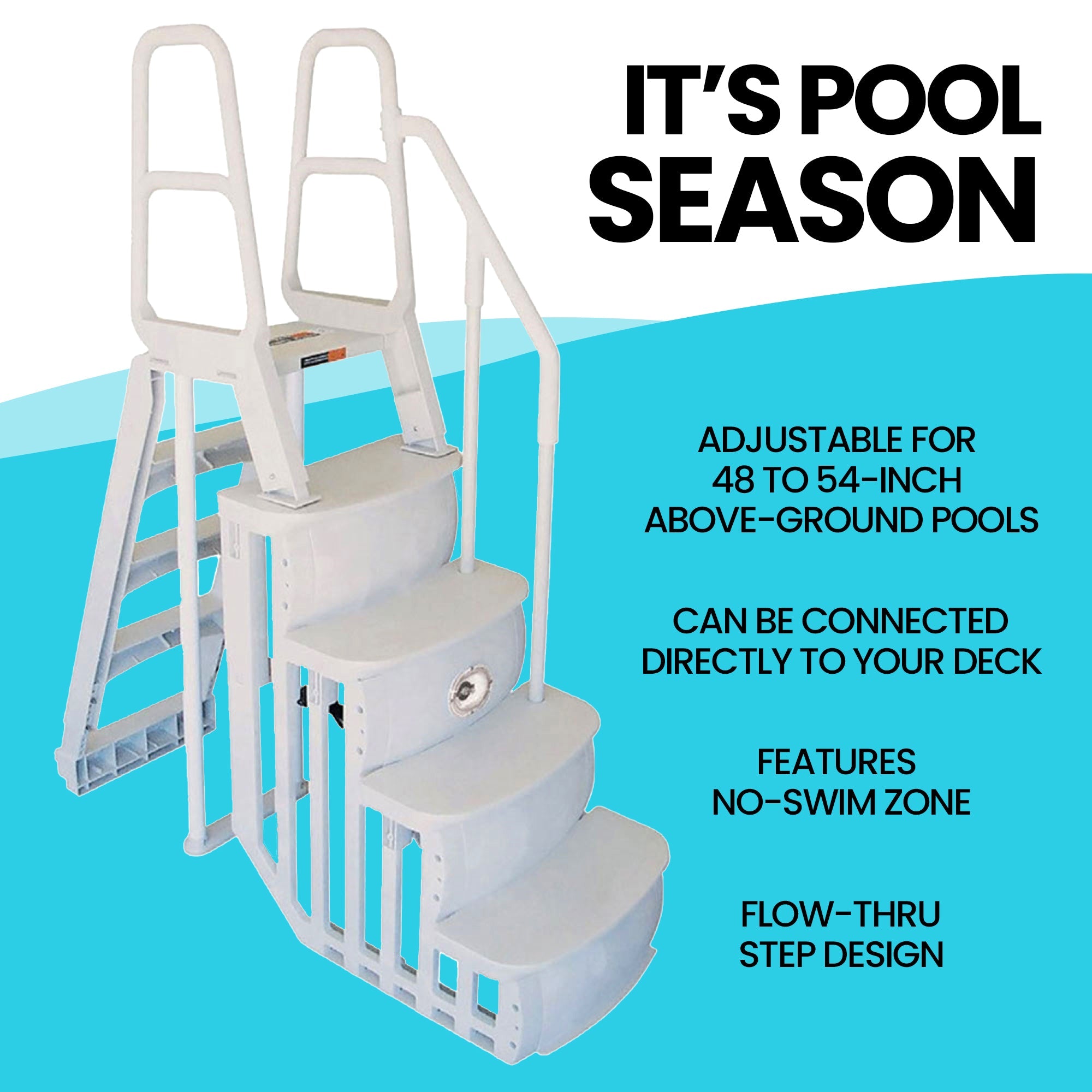 - Bundle includes an adjustable step system for above-ground pools and an LED smart light that mounts to the stairs