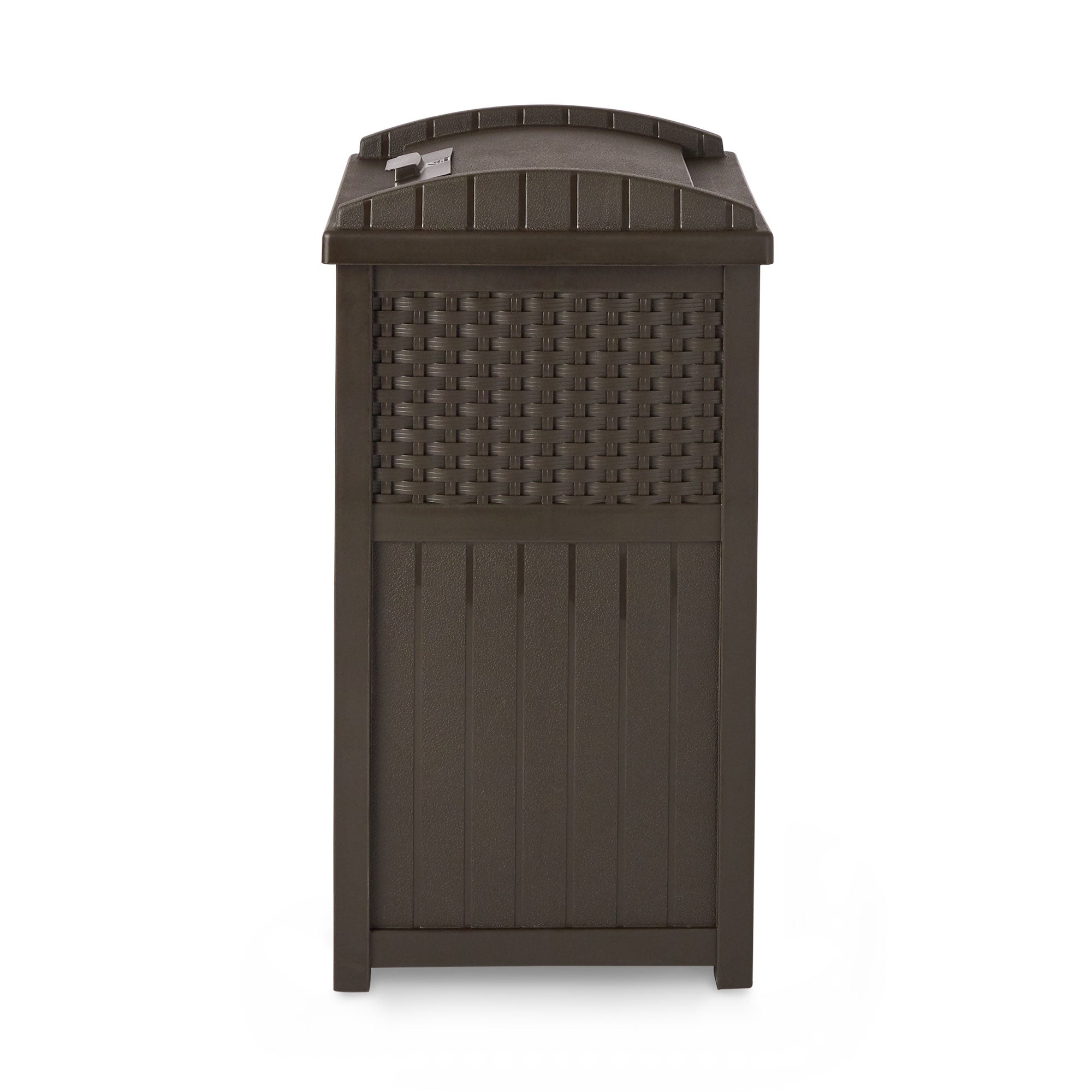 This Suncast outdoor trash hideaway has a stylish design that looks great on most patios or decks. The wicker design compliments most any patio furniture or home decor. This Suncast outdoor trash hideaway unit includes a latching lid and has a solid bottom panel, which keeps garbage from spilling out all over the patio or deck. Standard 30-33 gallon garbage bags fit perfectly inside this Suncast trash hideaway, so it's perfect for poolside areas, patios, and decks that get lots of use.