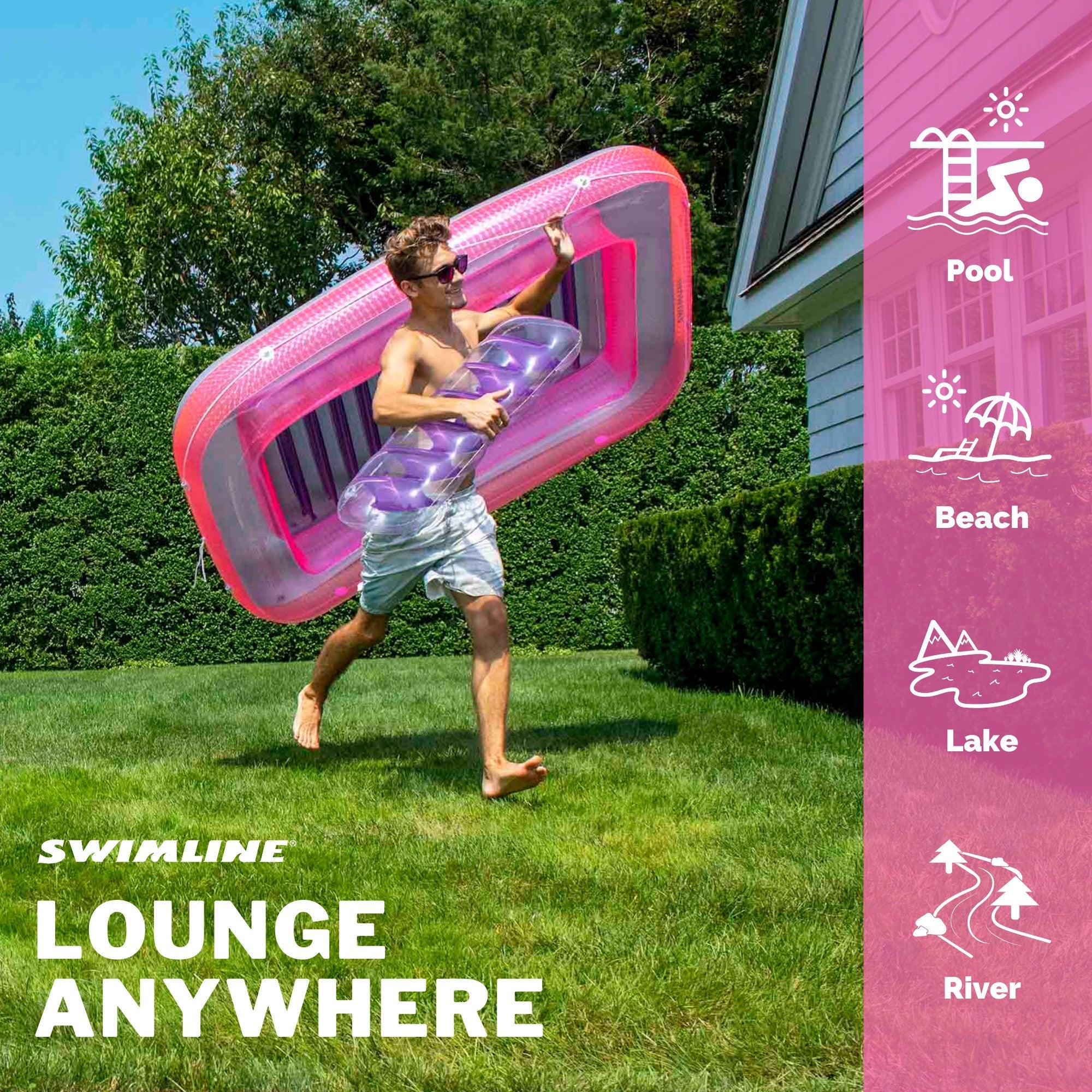 Stay cool this summer with this Swimline suntan tub float lounge. Its comfortable pillow design offers comfort and its sturdy vinyl construction with grab rope adds function. This Swimline tub float lounge can be used as a tub, pool or float. Add water for an extra cool ride! 1 buy = 3 chairs!
