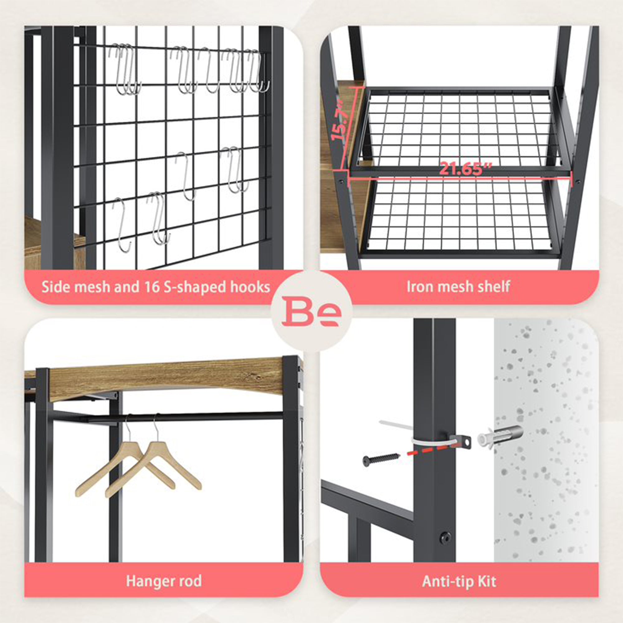 This open-space-designed freestanding wardrobe is the perfect solution for clothing storage in studio apartments, shared spaces, or rooms lacking built-in storage. The 2 hanger rods are perfect for storing dresses, dress shirts, blouses, slacks, jackets, and coats, while the side grids with adjustable hooks can hold your hats, bags, scarves, and accessories. Featured nested in the metal of the double racks are 3 smaller wooden shelves perfect for smaller-sized items.