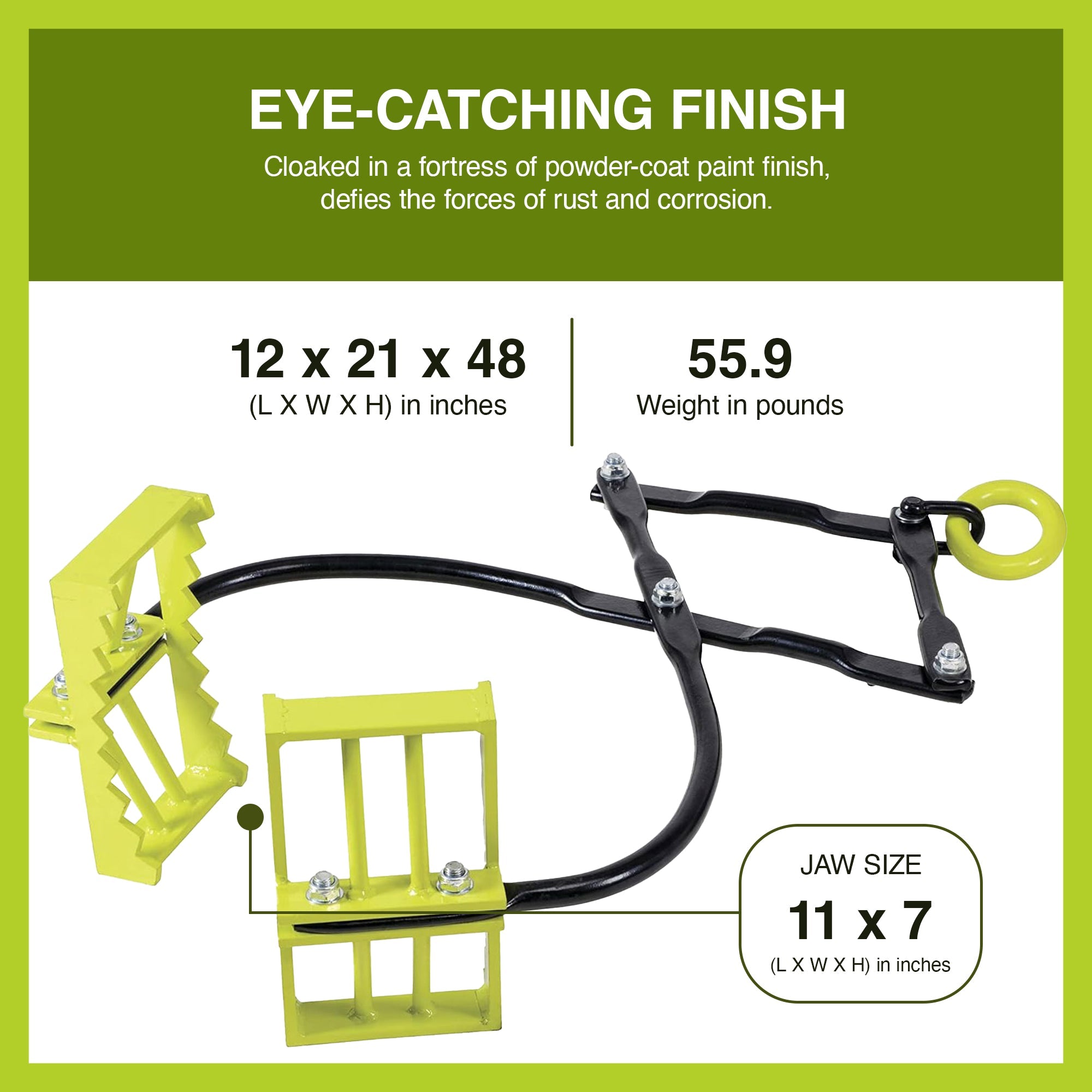 Equipped with jaws measuring an impressive 11 inches by 7 inches, the rock tong boasts hardened teeth that confidently sink into the challenge, providing a grip so secure that it's practically a rock-solid handshake with nature itself. The clever design also includes a heavy-duty loop, strategically placed for a seamless and easy chain hookup, making your heavy lifting endeavors a breeze.