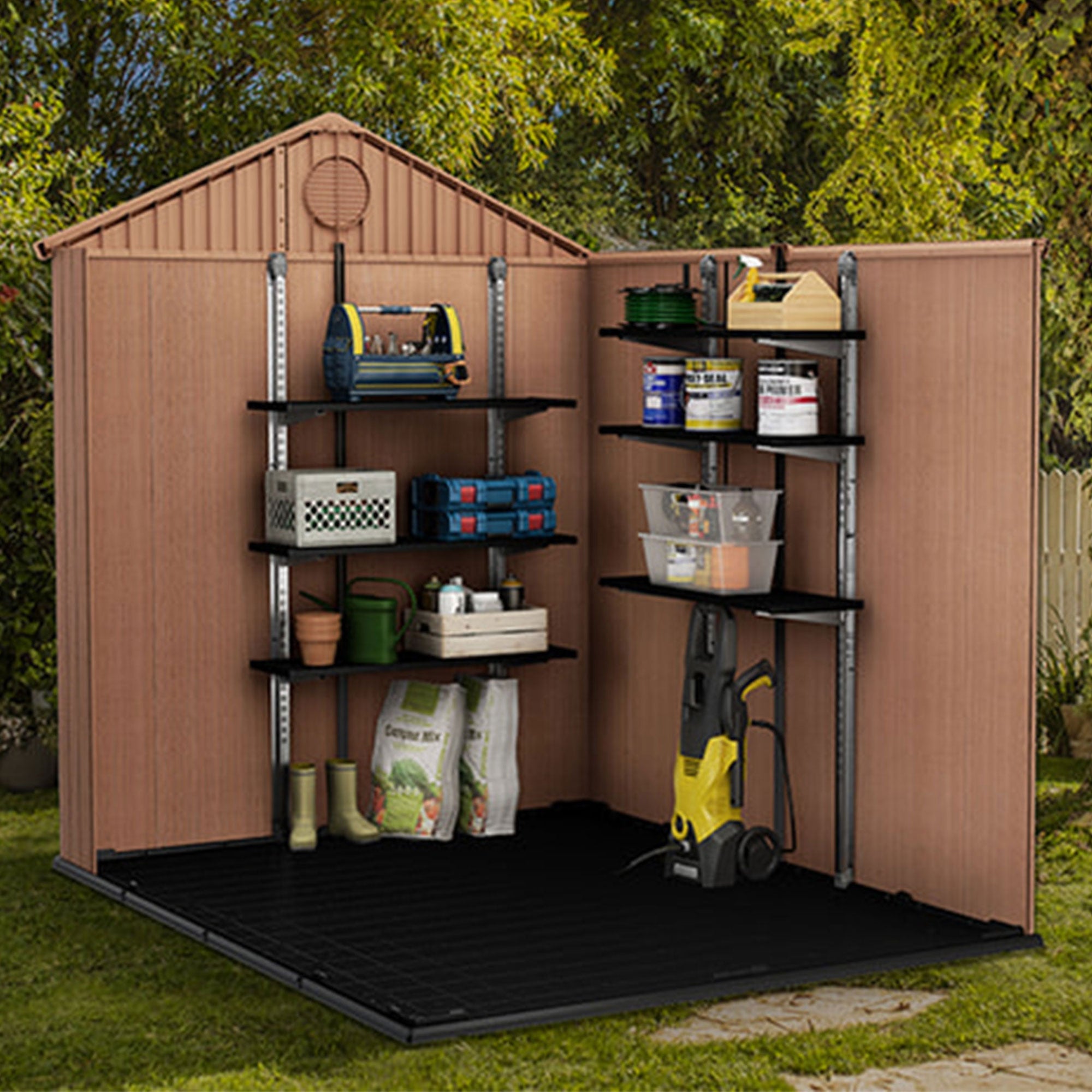Designed to elevate any outdoor storage space, each kit boasts 3 generously sized shelves, providing ample room to neatly arrange gardening tools, supplies, and more. Not only do the shelves optimize storage capacity, but they also free up valuable floor space, allowing you to effortlessly accommodate larger items and create a clutter-free environment.