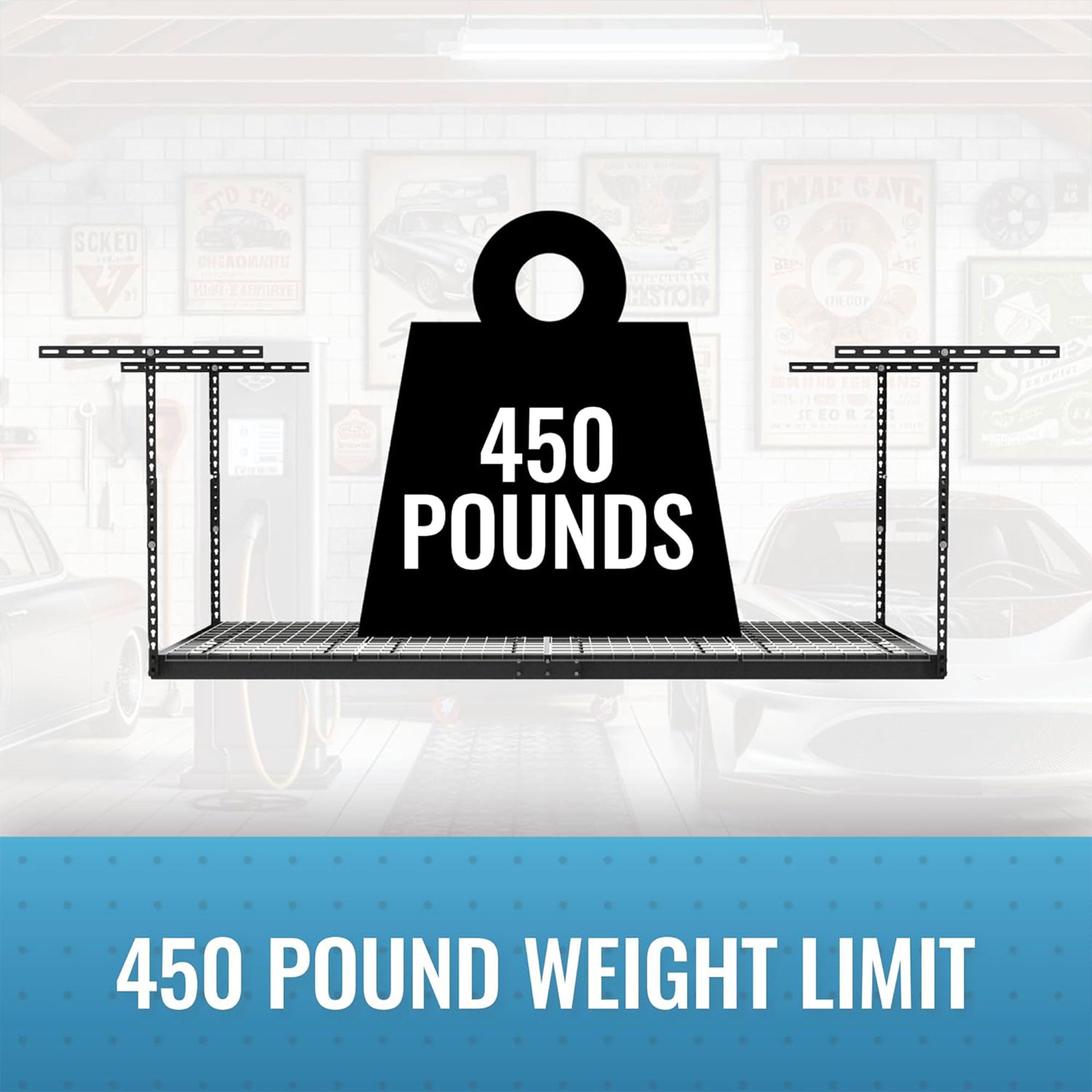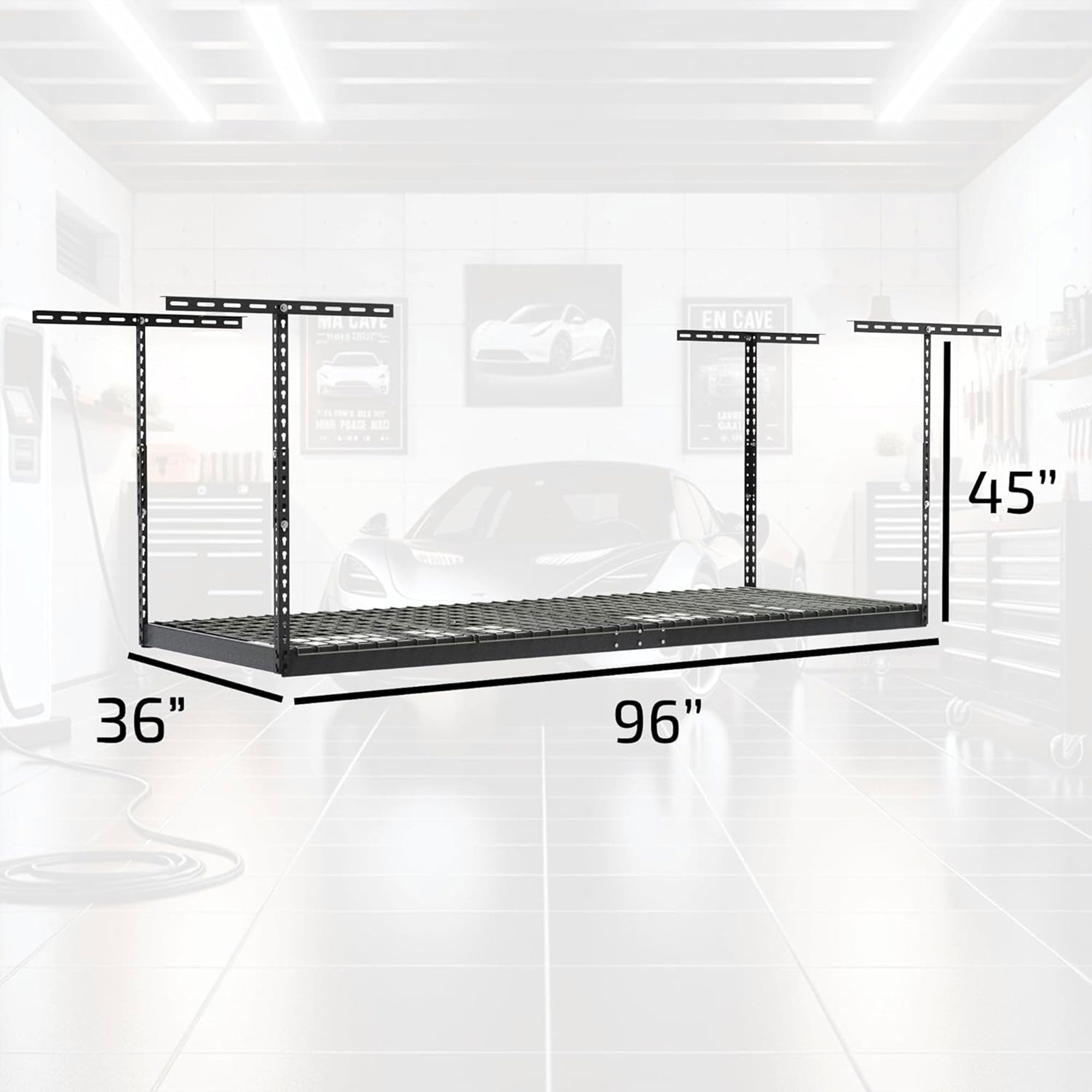 • Overhead garage storage rack tailored to fit seamlessly into any garage space, this 3 by 8-foot storage rack offers versatility and practicality