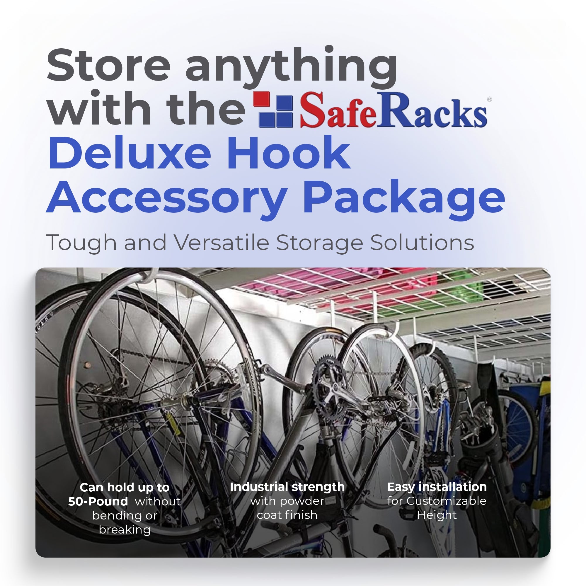 If you are already using the SafeRacks system, you are well aware of the ridiculous amount of space you have already saved. Prepare to be even more amazed by utilizing the SafeRacks Deluxe Hooks Accessory Package, a must-have for home and garage organization!