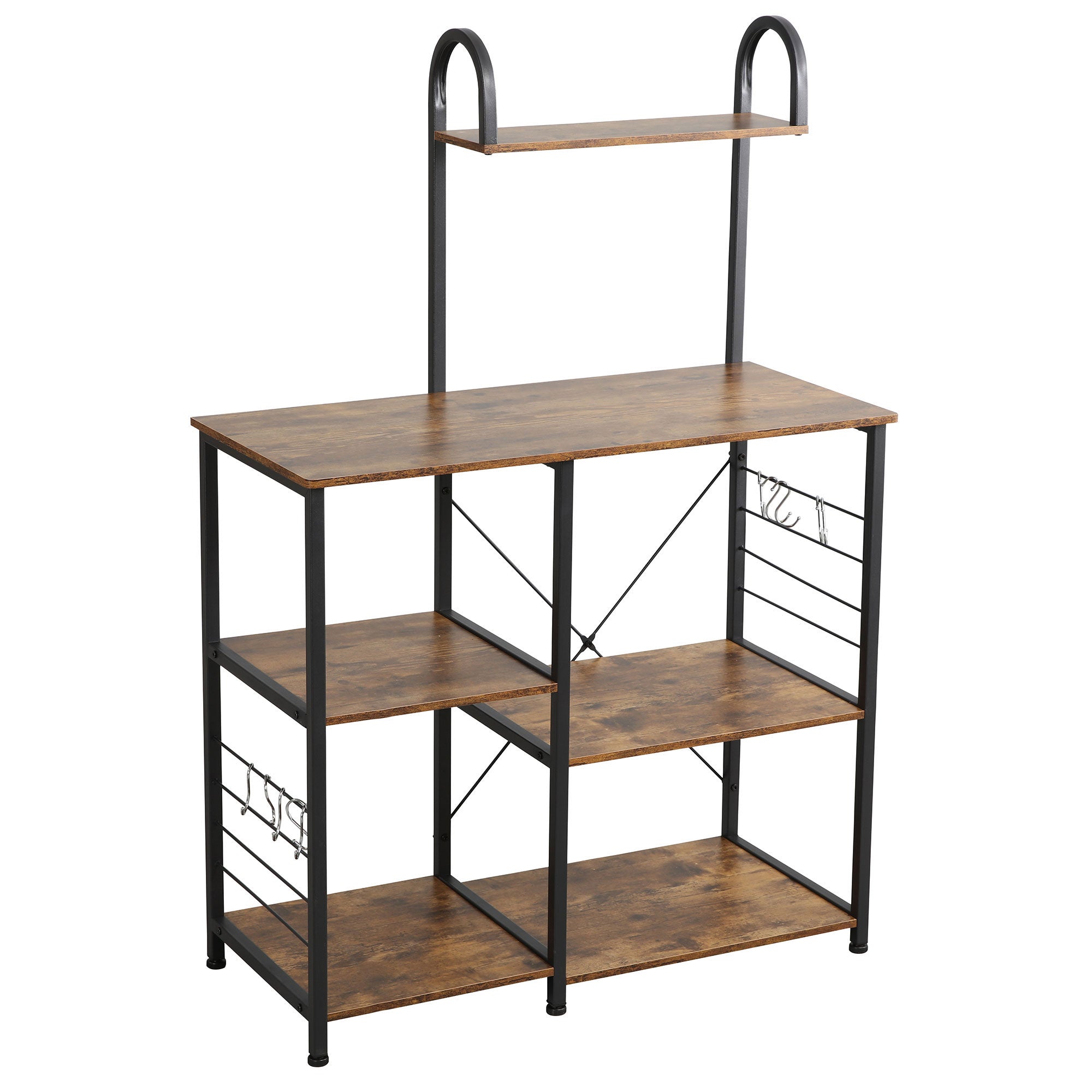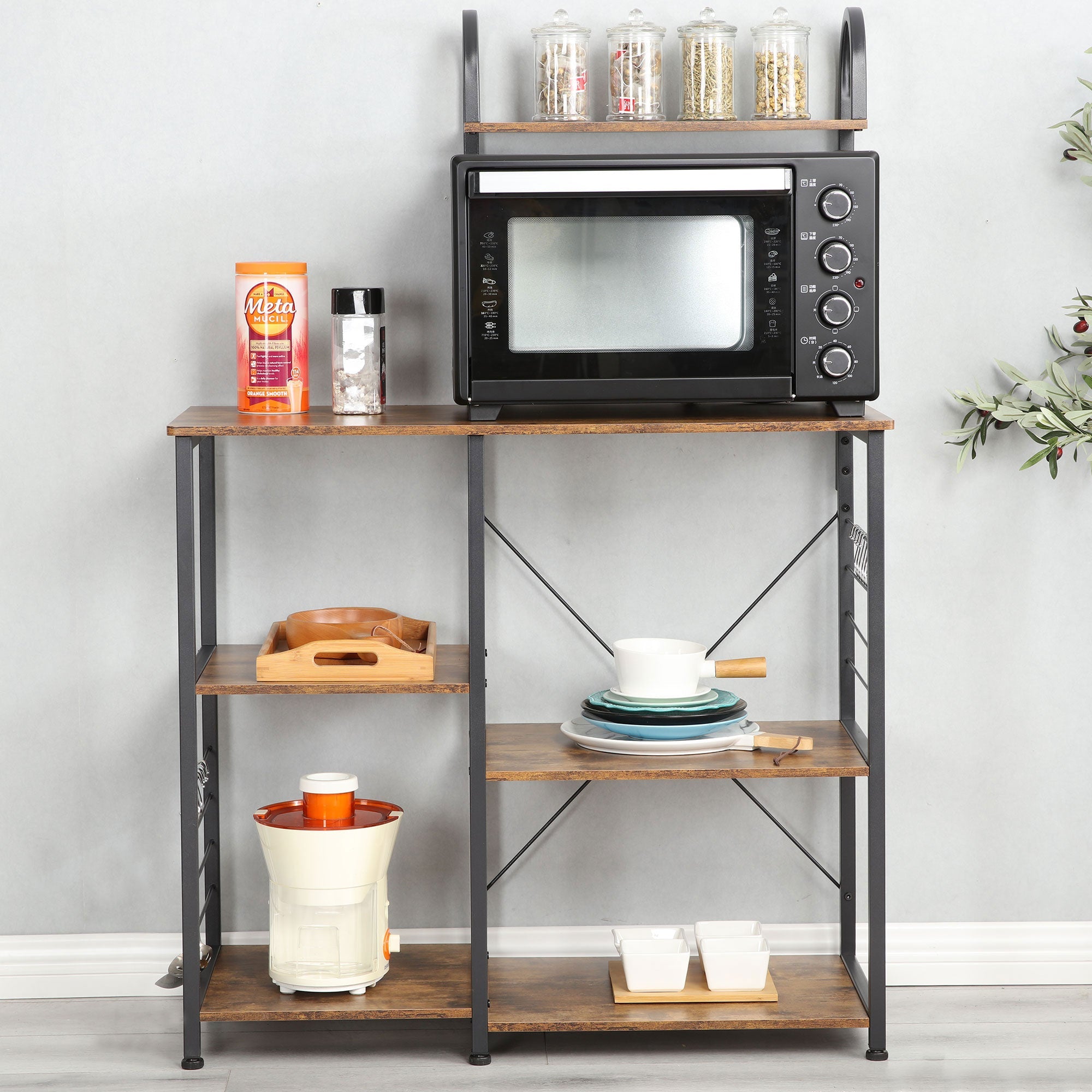 The classic look of this all-purpose shelving is not only stylish but efficient. The organizer is made of open particleboard and has a sturdy metal frame. An X-shaped bracket ensures stability, securely holding appliances on the shelving unit. Heavier items like your microwave, stacks of cookbooks, or piles of pots and pans will all find a spot here on the various tiers. Microwave, mini-oven, and spices shelves are arranged at different heights for a level of variability. S-shaped hooks provide hanging space for various cooking utensils or dry towels. Being both lightweight and having attached wheels, you can freely move this shelf around your living area with all appliances kept in place. This compact piece of furniture is a real all-rounder.