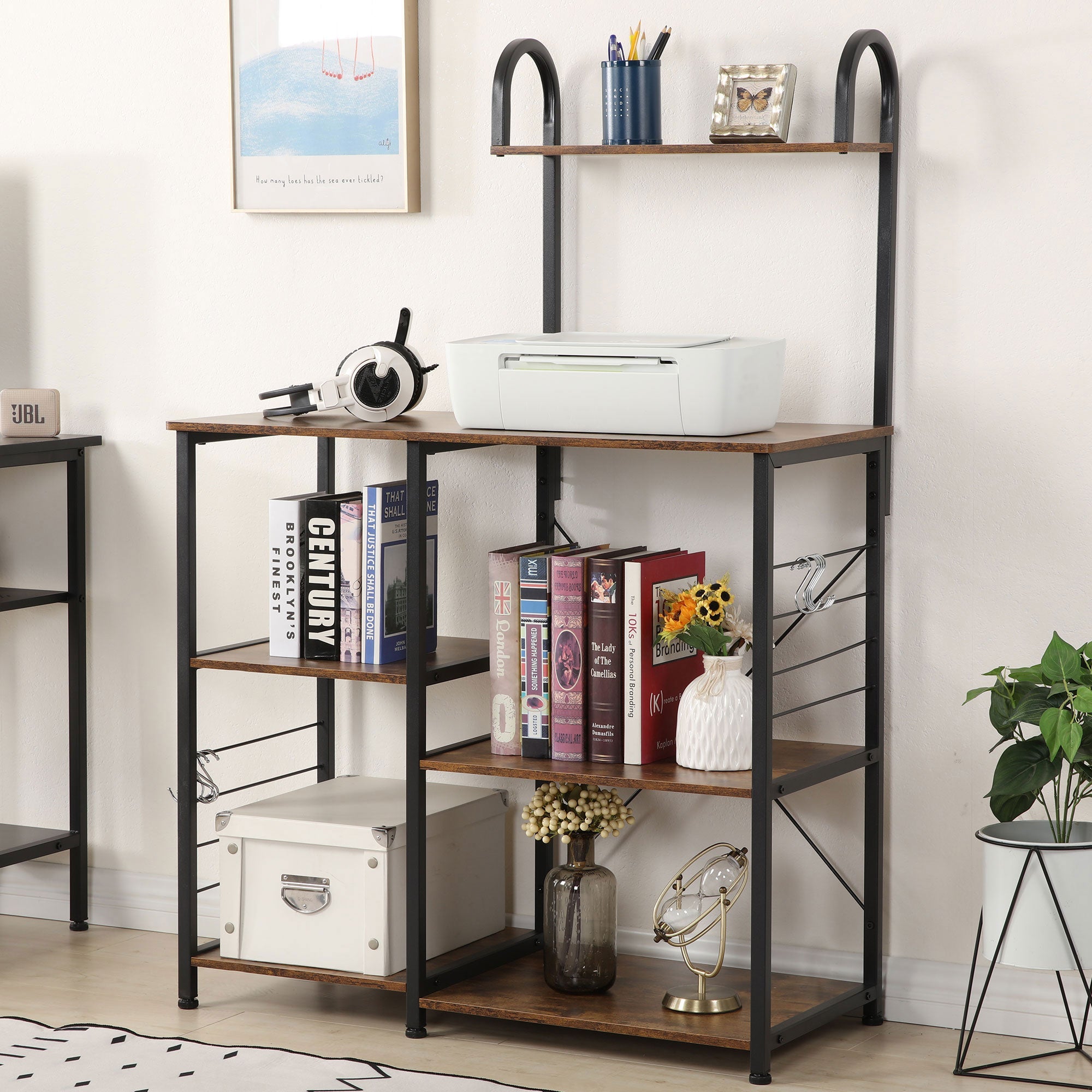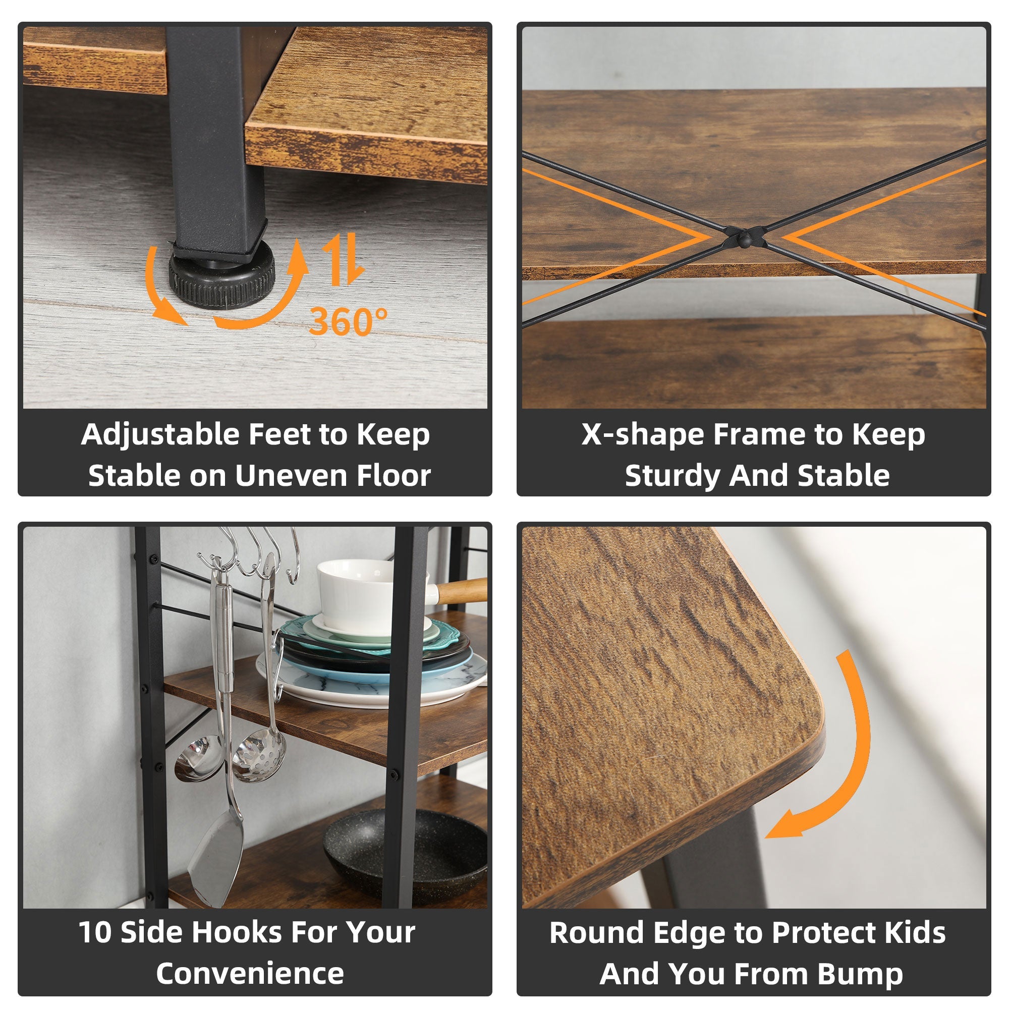 - Modern baker's rack is made up of 2 different 3-tiered and 4-tiered open durable particleboards and has a sturdy, rustic brown metal frame