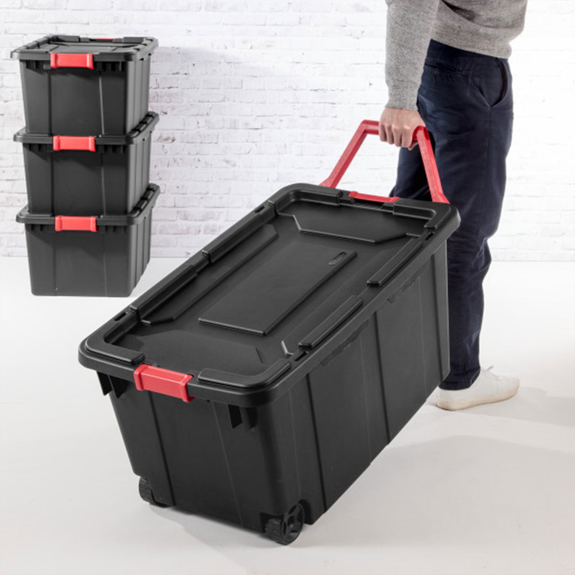 - Black tote design with red latches to easily identify where to open totes