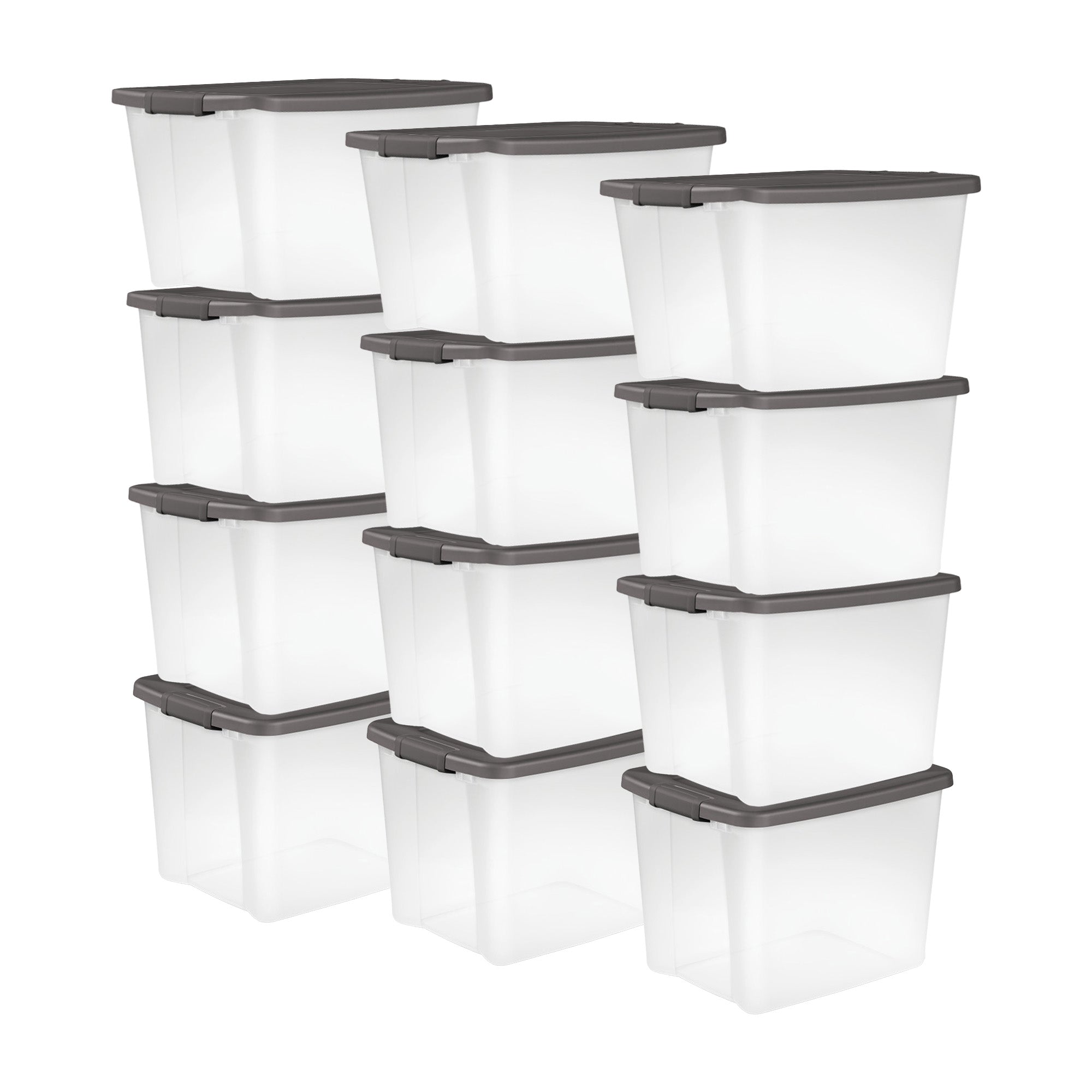 Cut out the clutter in your life with this 12-pack of Sterilite ShelfTotes 50-Quart Clear Latched Plastic Storage Containers. These plastic storage bins can hold up to 50 quarts of your belongings like school projects, clothing, bulk foods, paperwork, and photographs.
