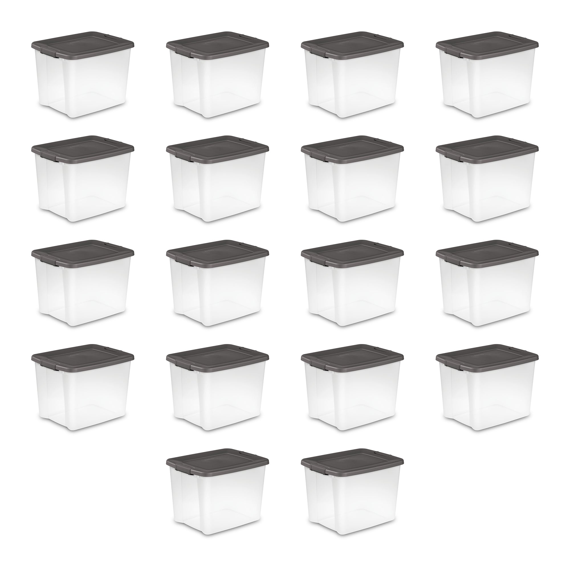 Cut out the clutter in your life with this 18-pack of Sterilite ShelfTotes 50-Quart Clear Latched Plastic Storage Containers. These plastic storage bins can hold up to 50 quarts of your belongings like school projects, clothing, bulk foods, paperwork, and photographs. Thanks to the heavy-duty construction your belongings will remain safely stored.