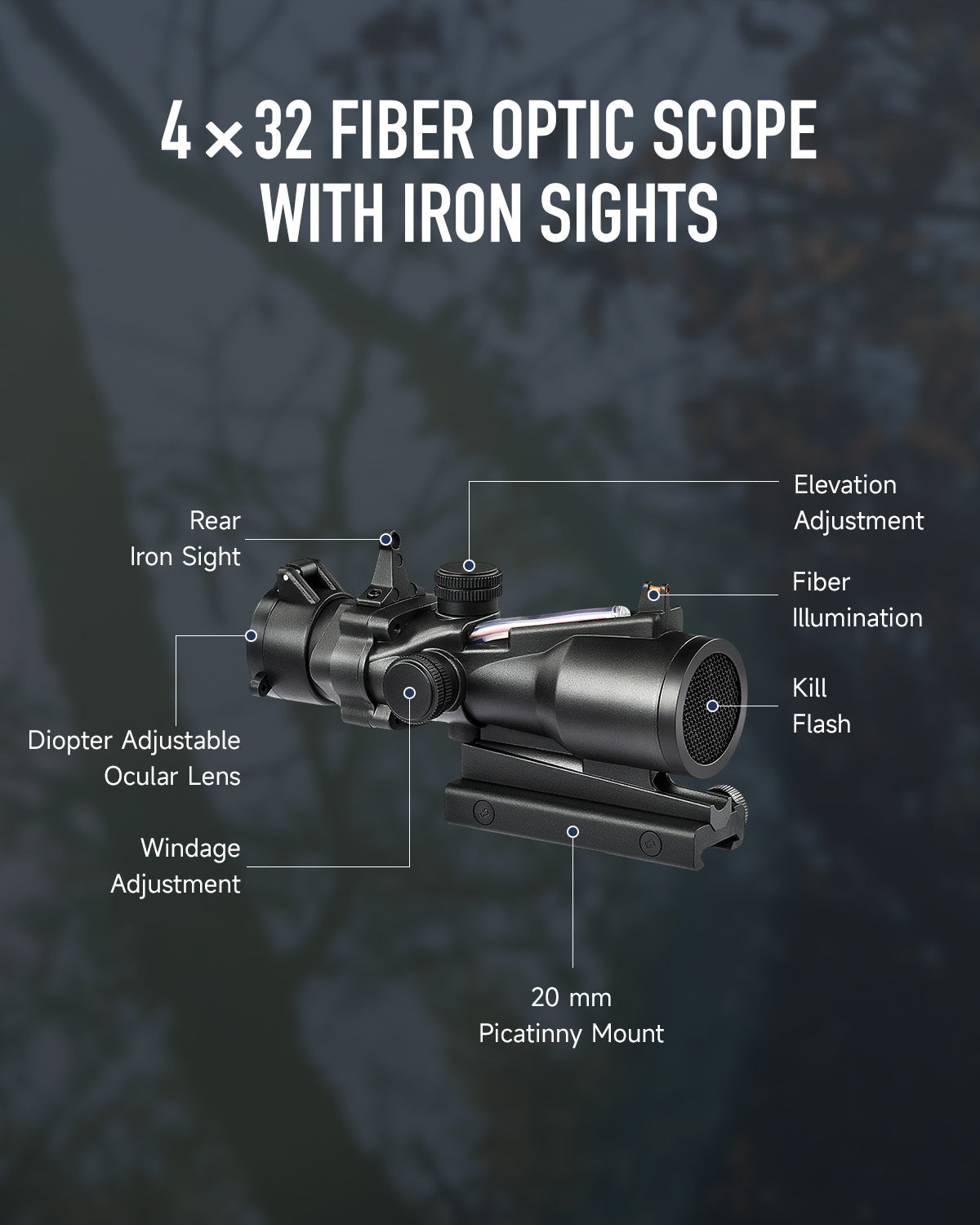 4x32 Prism Scope, Compact Tactical Rifle Scope with Fiber Reticle Sight, Iron Sights, Multicoated Lenses, Fits 20 mm Picatinny